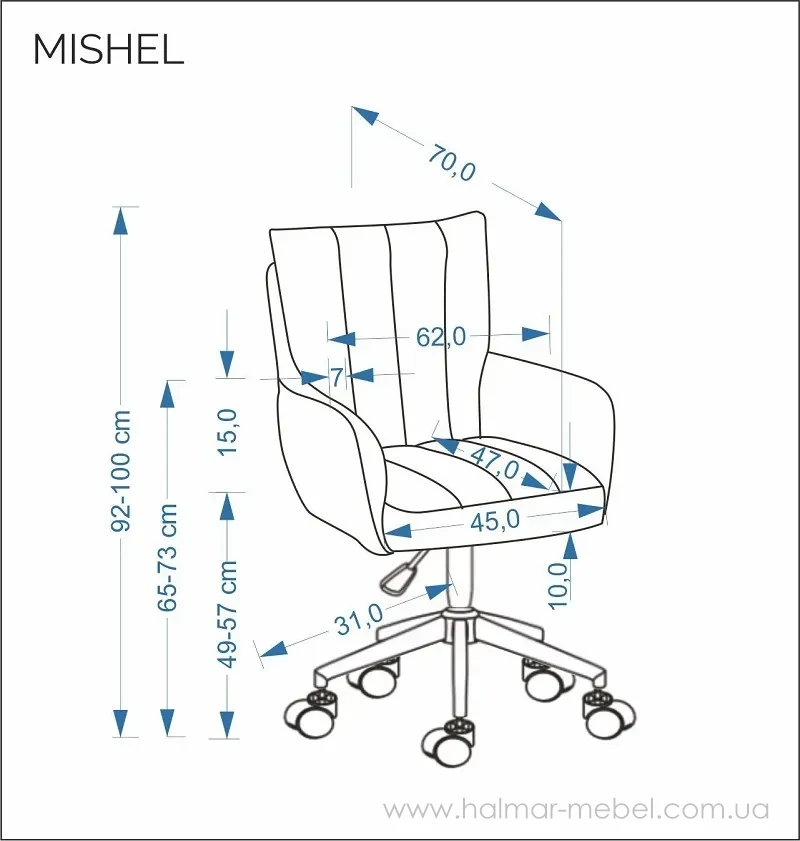 Кресло офисное поворотное MISHEL HALMAR бежевый – привлекательная новинка 2026 года для комфортного обучения и работы. Конструкция модели состоит из мобильной базы на колесиках, мягкого сиденья, спинки и подлокотников с обивкой из ткани CREMONA 14 бежевого цвета.