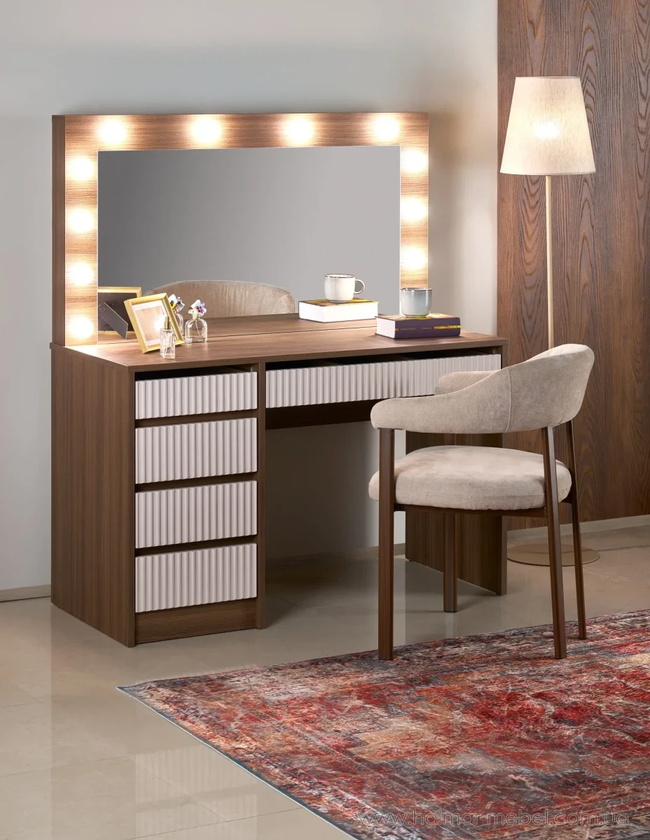 Стол туалетный HOLLYWOOD 2XL HALMAR кашемир/орех – новая цветовая версия популярной модели для спальни, женской комнаты, салона красоты и гримерной. Туалетка привлекает стильным и качественным исполнением. Конструкция стола включает в себя столешницу прямоугольной формы, пять выдвижных ящиков и зеркало с LED подсветкой.