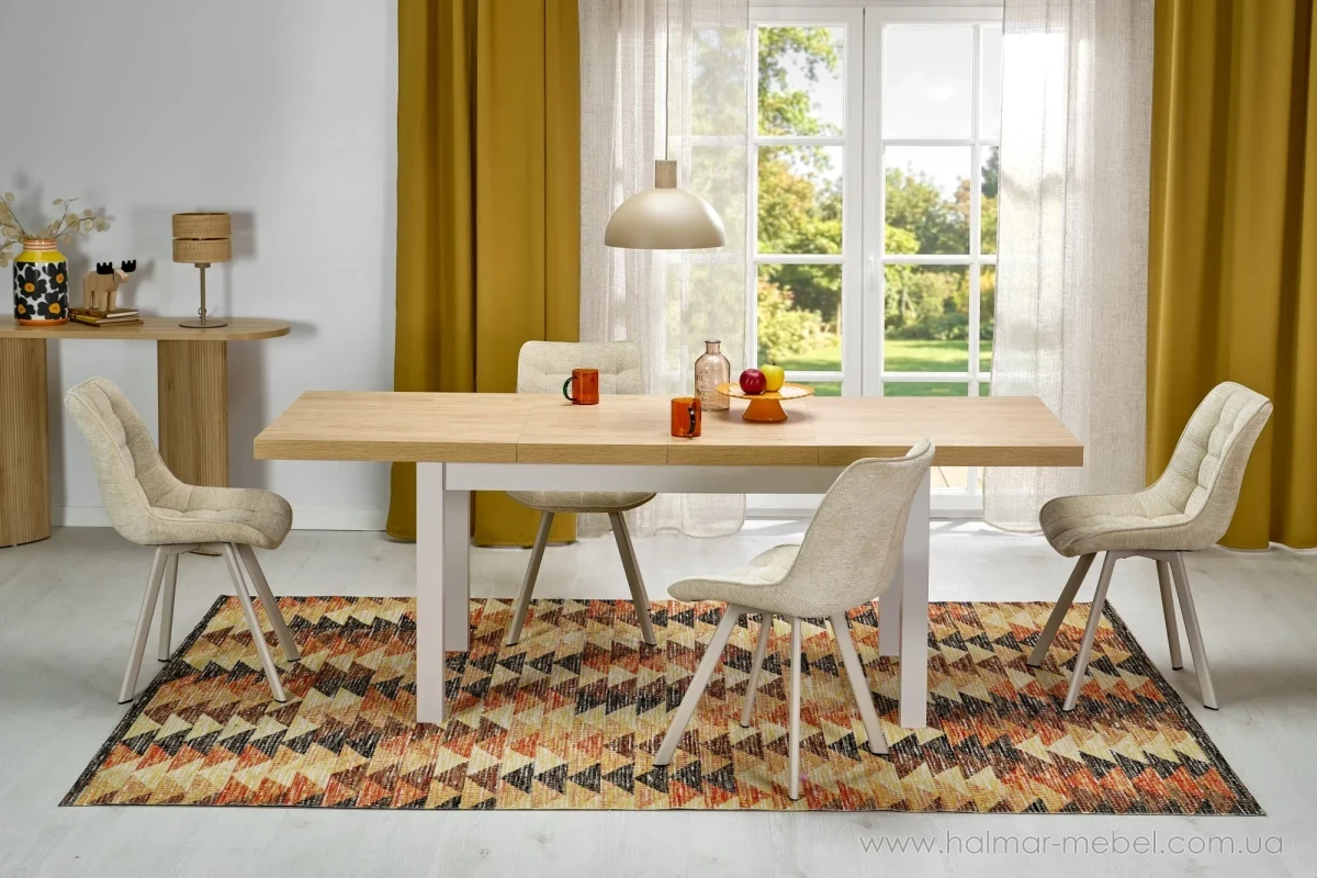 Стол обеденный раскладной TIAGO HALMAR 140(220)х80 дуб хикора/кашемир - новинка 20226 года, практичная модель для домашней обеденной зоны. Его конструкция состоит из каркаса с ножками и прямяугольной столешницы из ламинированной ДСП, длина которой в разложенном положении составляет 220 см и позволяяет разместить 6 человек.