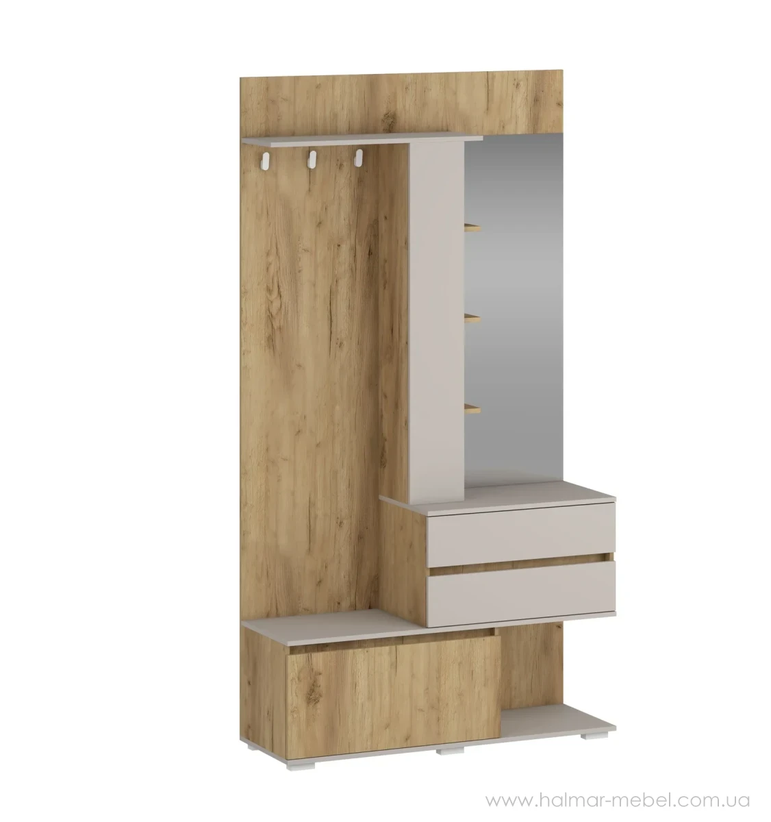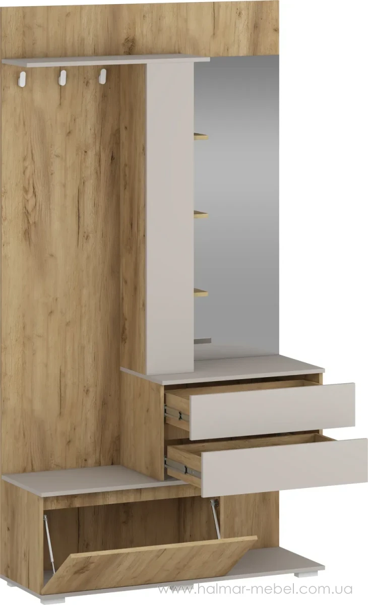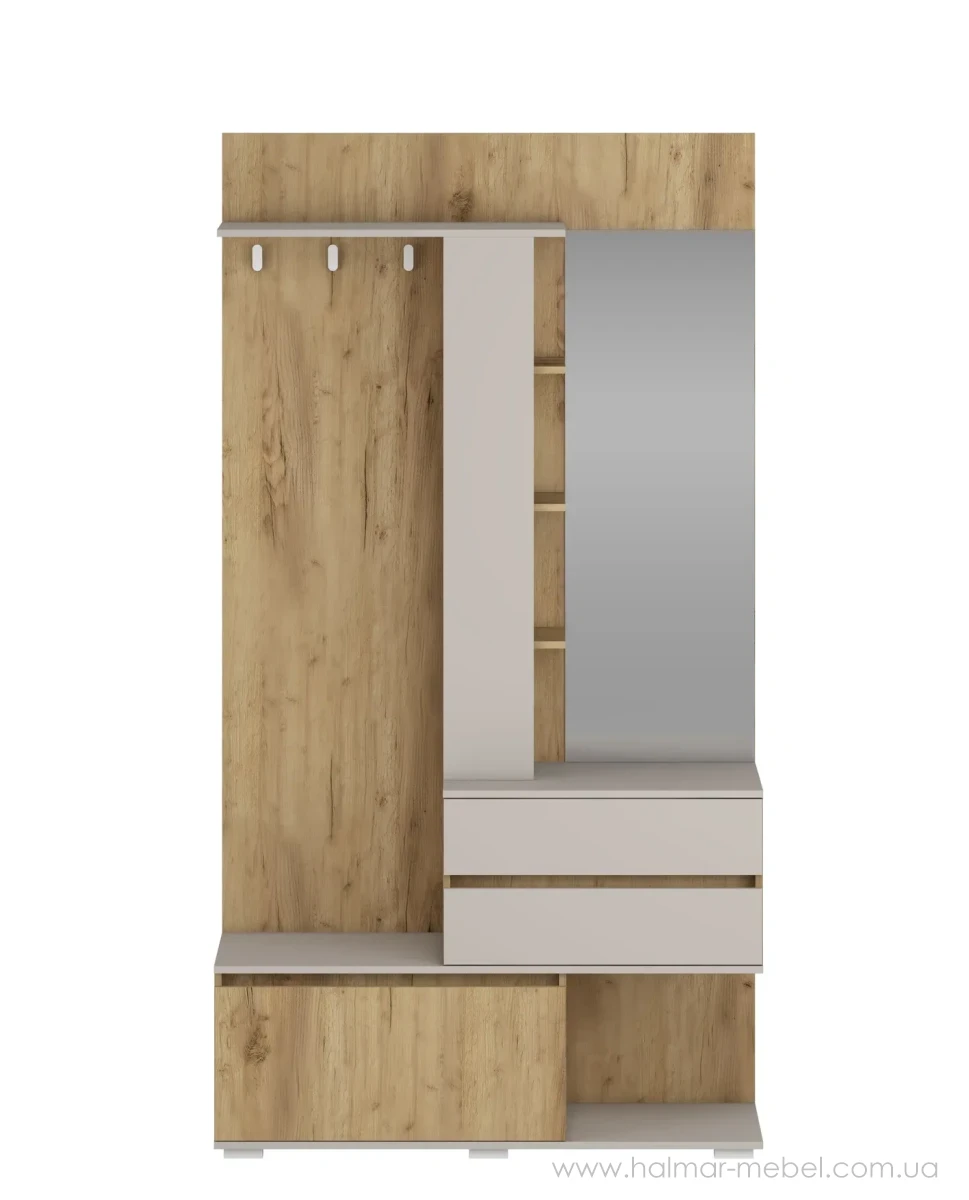 Передпокій BAFRA HALMAR дуб золотий/кашемір – новинка 2026 року, приваблива модель для невеликого приміщення. Конструкція передпокою включає корпус з дзеркалом, тумбу для взуття, 2 висувних ящика, настінну вішалку з гачками для одягу і полицею. Запропонований кольоровий асортимент дозволяє вибрати оптимальний варіант для вашого приміщення.