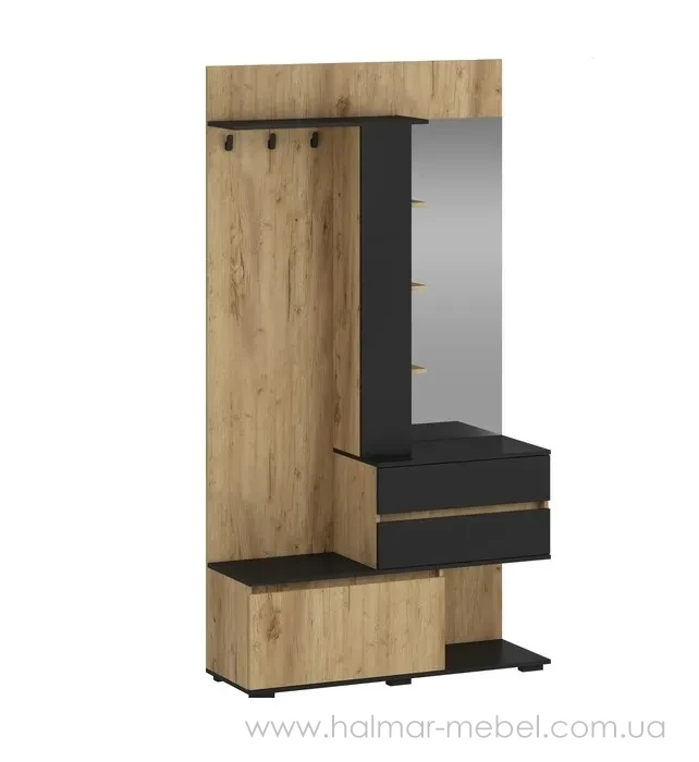 Передпокій BAFRA HALMAR дуб золотий/чорний – новинка 2026 року, приваблива модель для невеликого приміщення. Конструкція передпокою включає корпус з дзеркалом, тумбу для взуття, 2 висувних ящика, настінну вішалку з гачками для одягу і полицею. Запропонований кольоровий асортимент дозволяє вибрати оптимальний варіант для вашого приміщення.