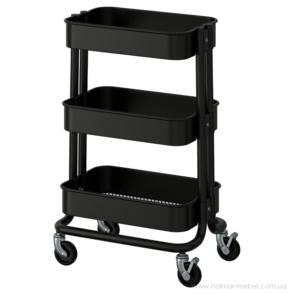 Тележка RÅSKOG IKEA черный - компактная и удобная система хранения для кухонных, офисных принадлежностей и т.д. Тележка также обеспечит дополнительное полезное пространство в санузле, на балконе и других помещениях. Колесики позволяют легко передвигать конструкцию, а система блокирования обеспечивает ее устойчивость.