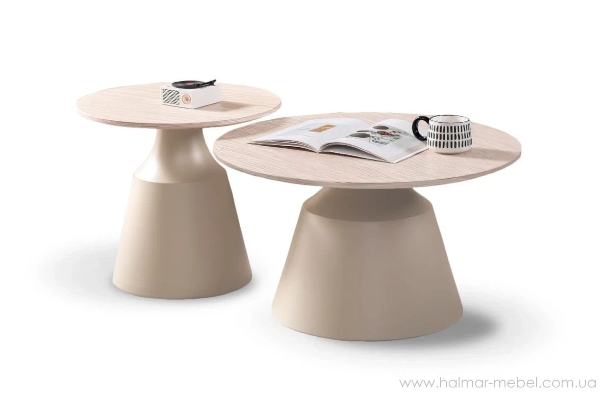 ZURICH HALMAR травертин/кашемір - комплект із 2-х журнальних столиків, стильна новинка 2026 року. Конструкція кожного столика складається із сталевого каркасу та круглої стільниці з ламінованої МДФ з ефектом каменю.