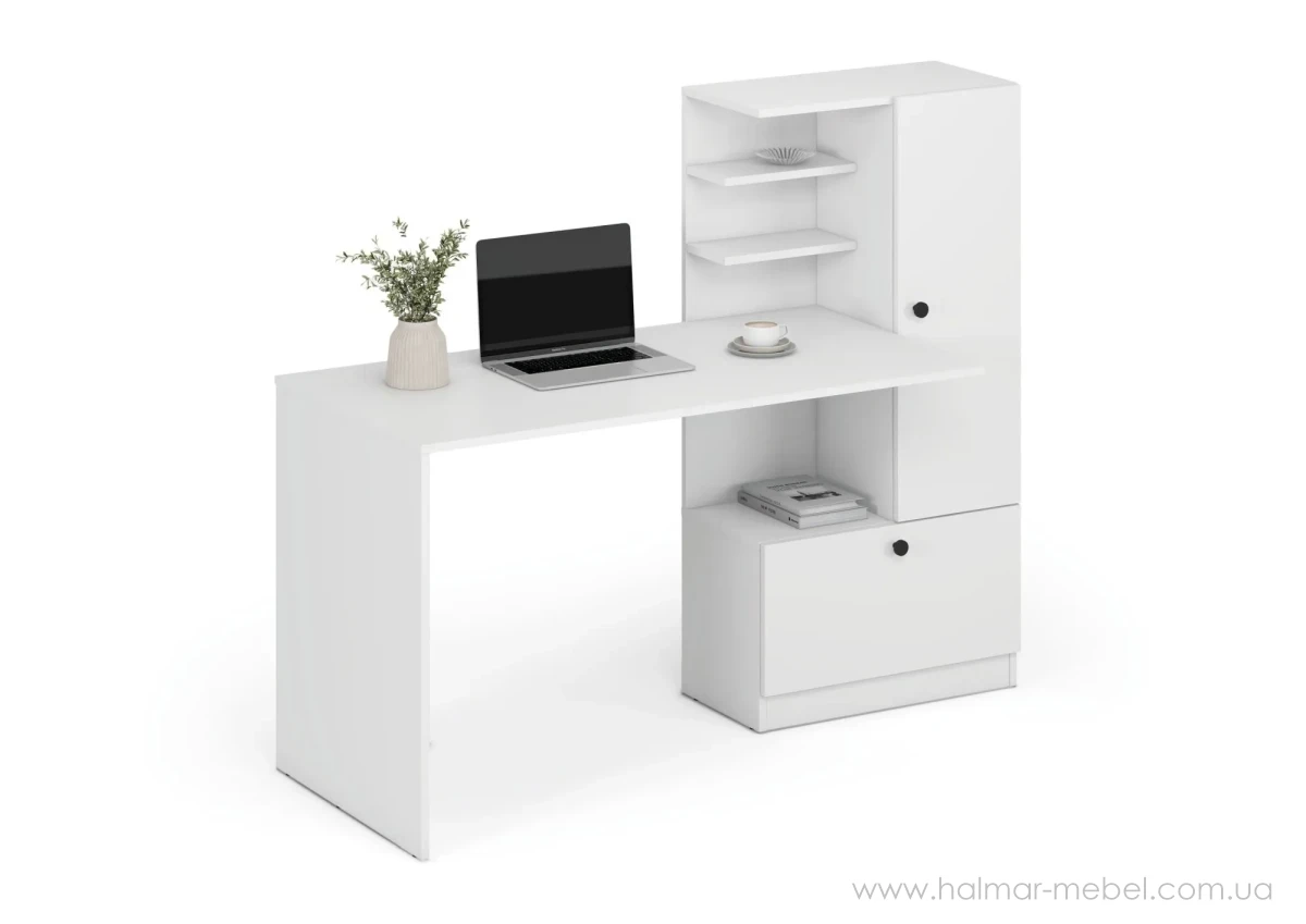 Стіл письмовий HOBAS HALMAR білий - приваблива новинка для комфортної роботи або навчання. Конструкція столу включає стільницю, 2 тумби з дверцятами, а також полиці та відкриту нішу для книг і канцелярського приладдя.