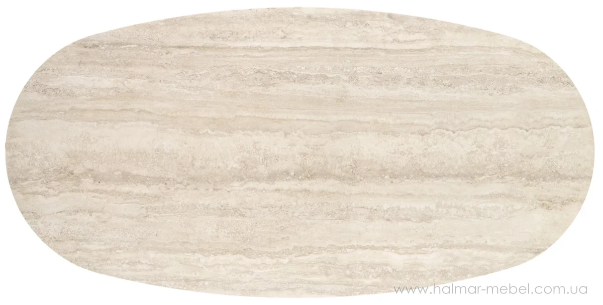 Стіл обідній JULIUS HALMAR світлий травертін - ефектна новинка 2026 року, яка чудово доповнить інтер'єр сучасної вітальні. Конструкція складається з чорного каркасу та керамічної стільниці овальної форми в кольорі світлого каменю.