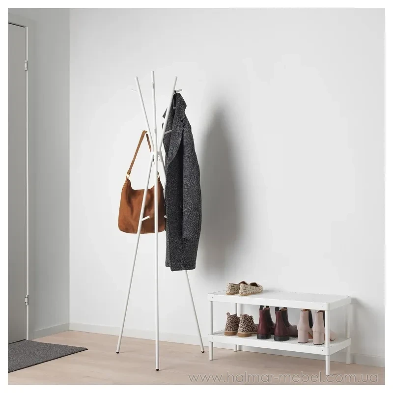 Вішалка підлогова EKRAR IKEA білий - стильний і функціональний елемент інтер'єру передпокою. Конструкція вішалки складається зі сталевого каркасу оригінальної форми з гачками для одягу та аксесуарів.