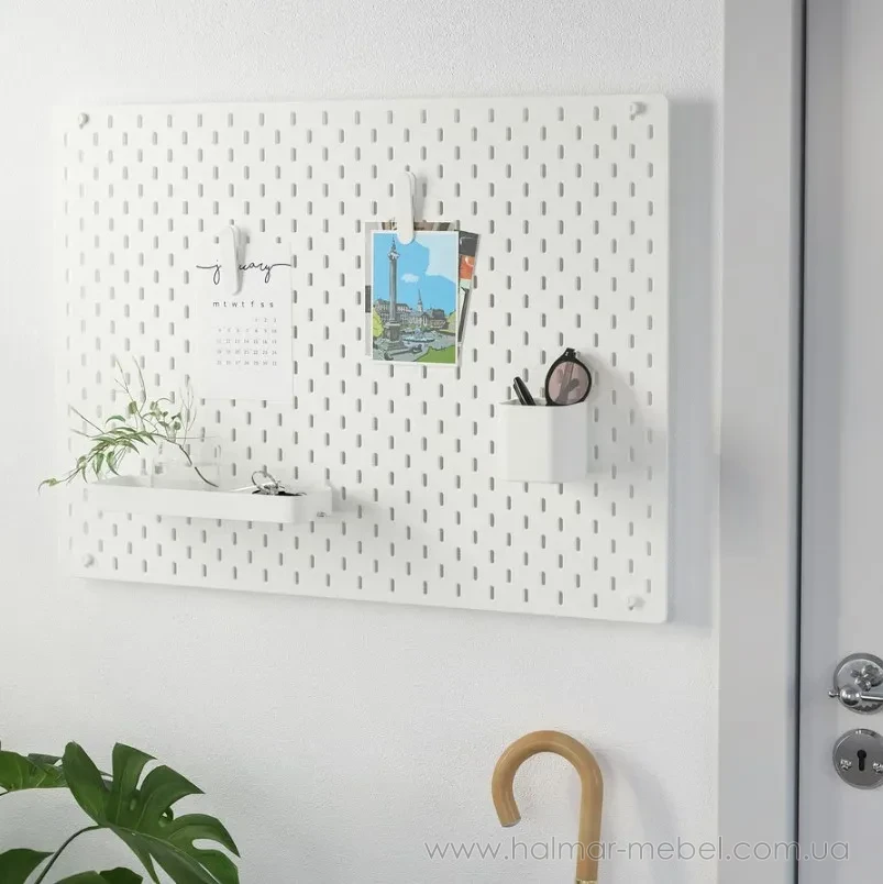 Дошка перфорована комбінована SKÅDIS IKEA 76х56 білий (або пегборд) – популярний елемент організації простору завдяки своїй універсальності, здатності заощаджувати місце та можливості адаптації до різних потреб. Сталева конструкція є дошкою з рядами отворів, на які можна кріпити різні предмети, використовуючи спеціальні гачки або кілочки. Перфоровані дошки активно використовуються у майстернях, кухнях, офісах та дитячих кімнатах.