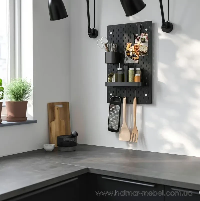 Дошка перфорована комбінована SKÅDIS IKEA 36х56 чорний (або пегборд) – популярний елемент організації простору завдяки своїй універсальності, здатності заощаджувати місце та можливості адаптації до різних потреб. Сталева конструкція є дошкою з рядами отворів, на які можна кріпити різні предмети, використовуючи спеціальні гачки або кілочки. Перфоровані дошки активно використовуються у майстернях, кухнях, офісах та дитячих кімнатах.