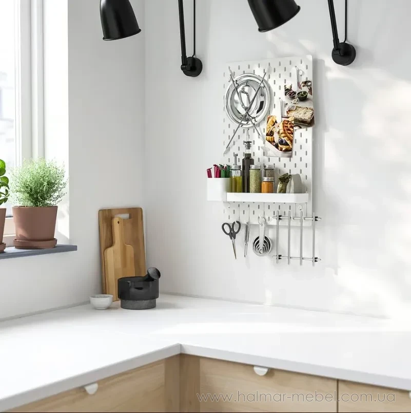 Дошка перфорована комбінована SKÅDIS IKEA 36х56 білий (або пегборд) – популярний елемент організації простору завдяки своїй універсальності, здатності заощаджувати місце та можливості адаптації до різних потреб. Сталева конструкція є дошкою з рядами отворів, на які можна кріпити різні предмети, використовуючи спеціальні гачки або кілочки. Перфоровані дошки активно використовуються у майстернях, кухнях, офісах та дитячих кімнатах.