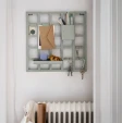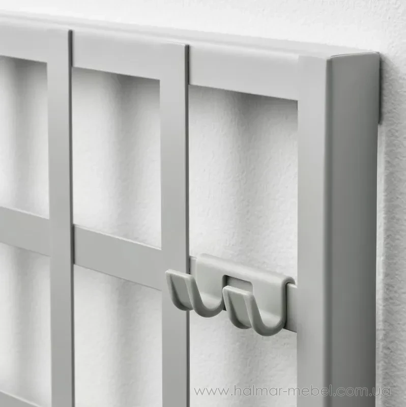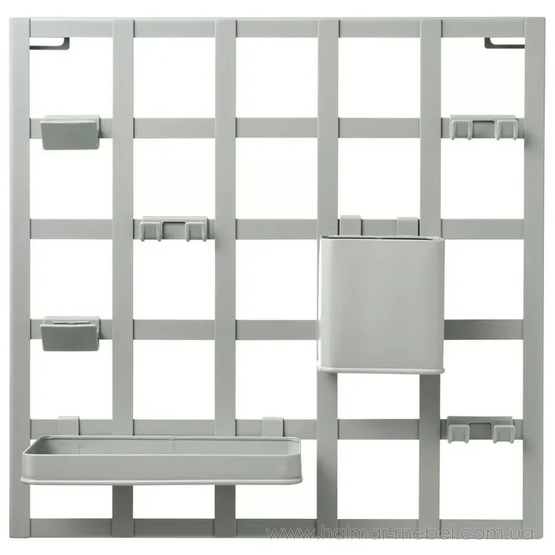 Панель для зберігання SNICKRA IKEA сіро-зелений - практичний настінний елемент розміщення корисних дрібниць в інтер'єрі. Конструкція є сталевими гратами сіро-зеленого кольору з 8-ма секціями, контейнером, поличкою, 2-ма затискачами і 3-ма гачками.