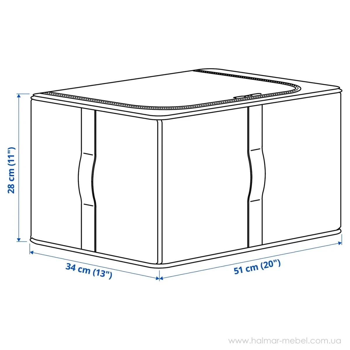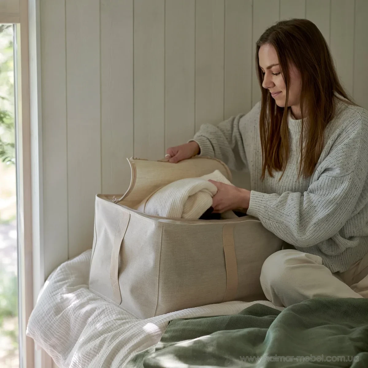 Контейнер для одягу PURRPINGLA IKEA бежевий – аксесуар, призначений для зручного зберігання та транспортування речей. Його конструкція є коробкою прямокутної форми, верхня частина якої закривається за допомогою застібки-блискавки. Контейнер виготовлений із поліестеру, міцного, зносостійкого матеріалу. Вентиляційні отвори біля ручок забезпечують вентиляцію. У складеному положенні контейнер компактний, займає мало місця.