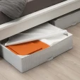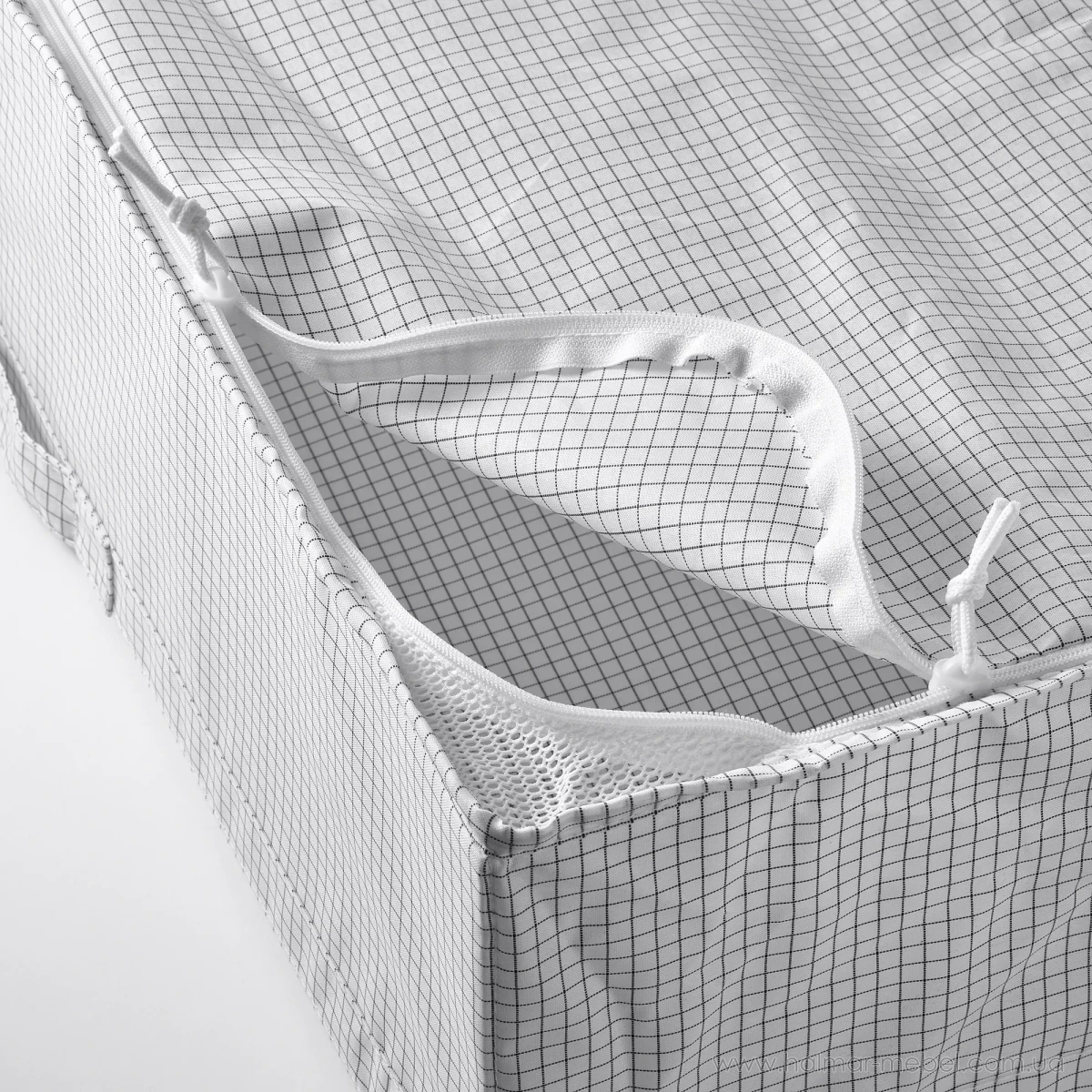Контейнер для одягу STUK IKEA білий – аксесуар, призначений для зручного зберігання та транспортування речей. Його конструкція є коробкою прямокутної форми, верхня частина якої закривається за допомогою застібки-блискавки. Контейнер виготовлений із поліестеру, міцного, зносостійкого матеріалу. Сітчасті вставки забезпечують вентиляцію. У складеному положенні контейнер компактний, займає мало місця.