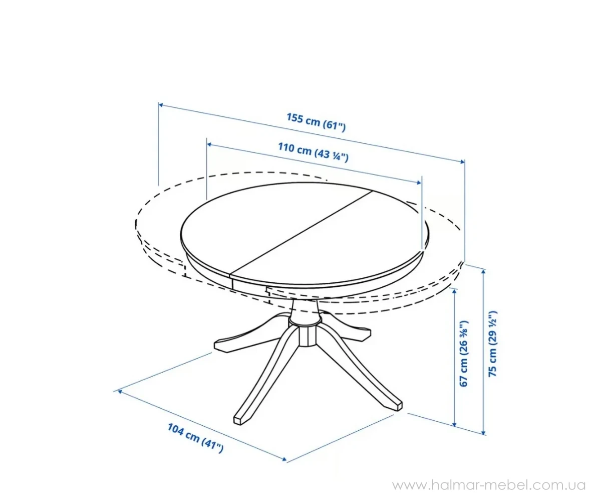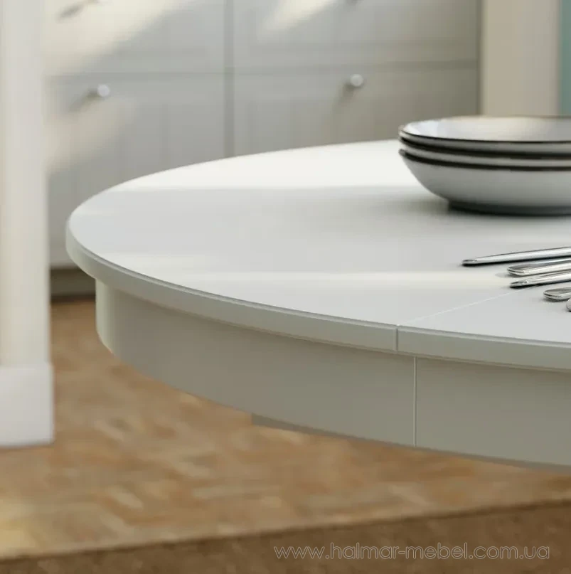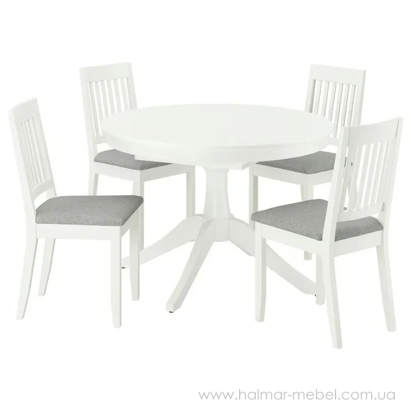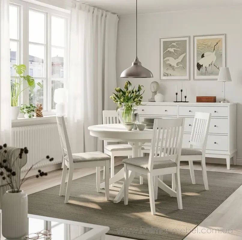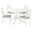 Комплект обідній стіл і 4 стільці ROSENTORP/NÄSINGE IKEA білий - ефектна і функціональна пропозиція для сучасного та класичного інтер'єру. У комплект входить розкладний обідній стіл з нової колекції ROSENTORP IKEA. Його конструкція включає в себе дерев'яний каркас і круглу стільницю діаметром 110 см з поверхнею з меламіну. У розкладеному положенні довжина стільниці становить 155 см і дозволяє розмістити 6 осіб. Обідній комплект доповнюють 4 зручних стільці з колекції NÄSINGE IKEA з м'яким сидінням і високою спинкою.