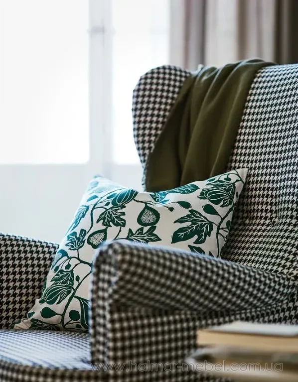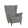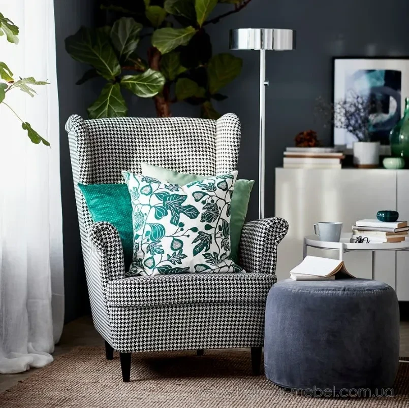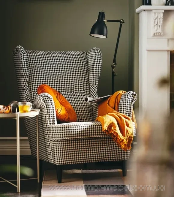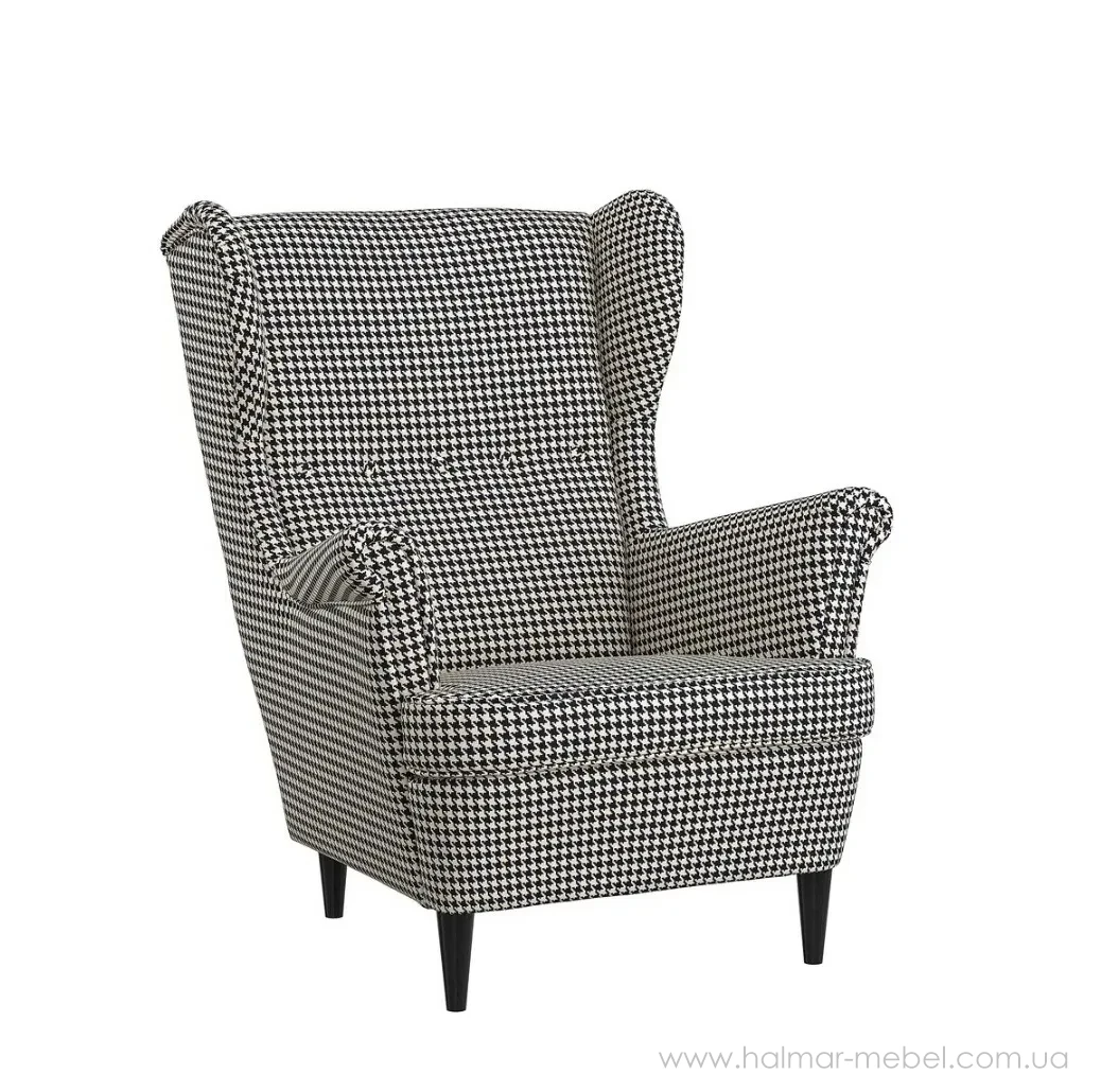 Крісло STRANDMON IKEA чорно-бежеве - приваблива модель в класичному стилі. Конструкція крісла включає в себе каркас на дерев'яних ніжках, м'яке сидіння, високу спинку та зручні підлокітники. В якості оббивки використана тканина Vibberbo з принтом «гусячі лапки» чорно-бежевого кольору.