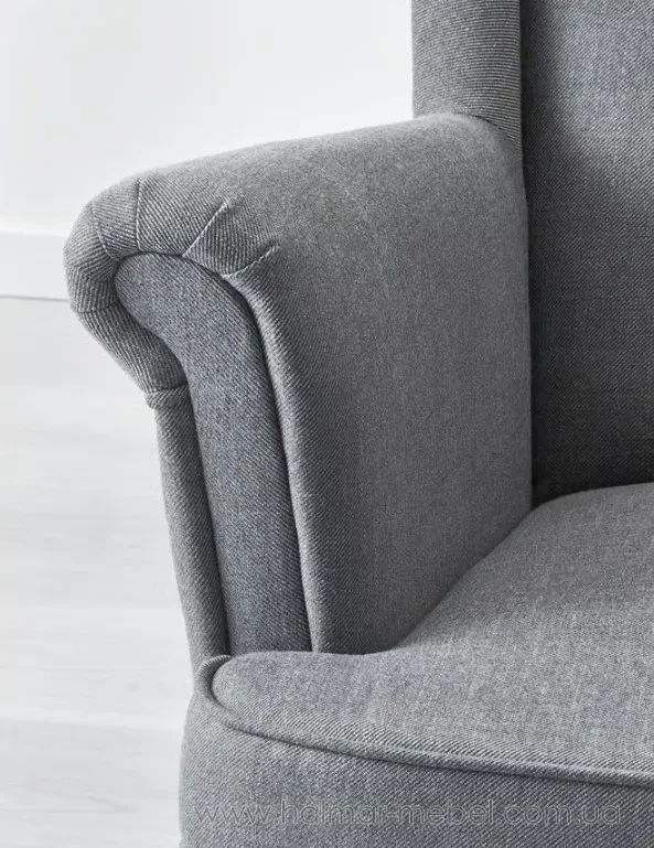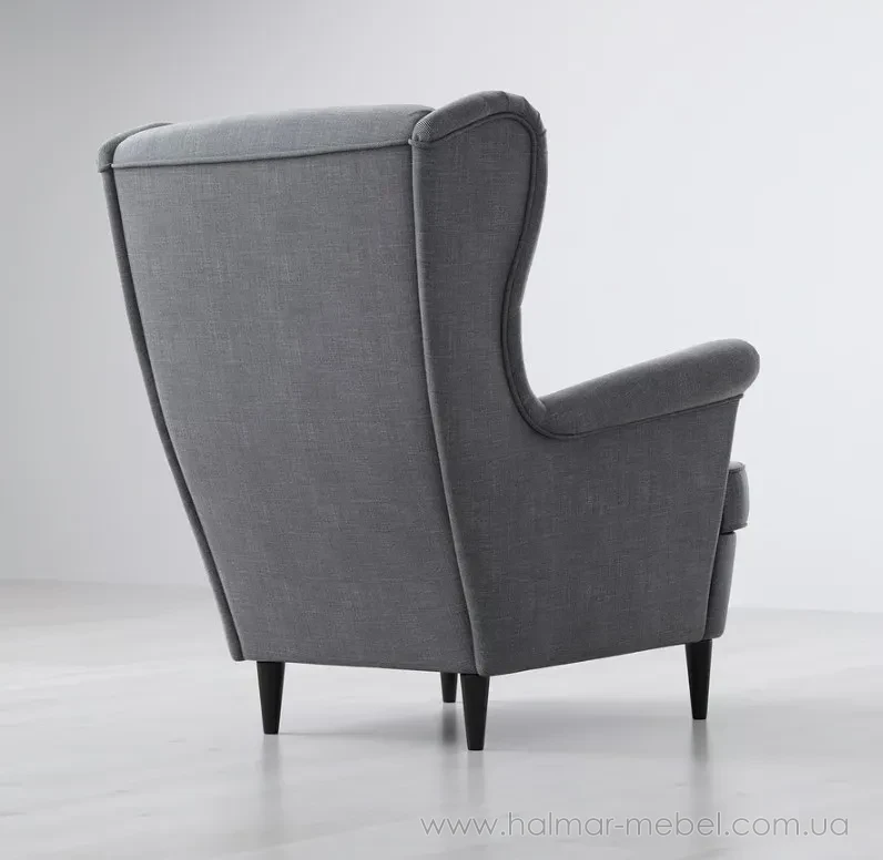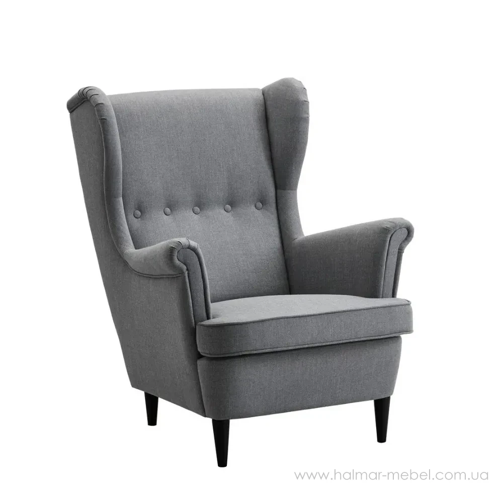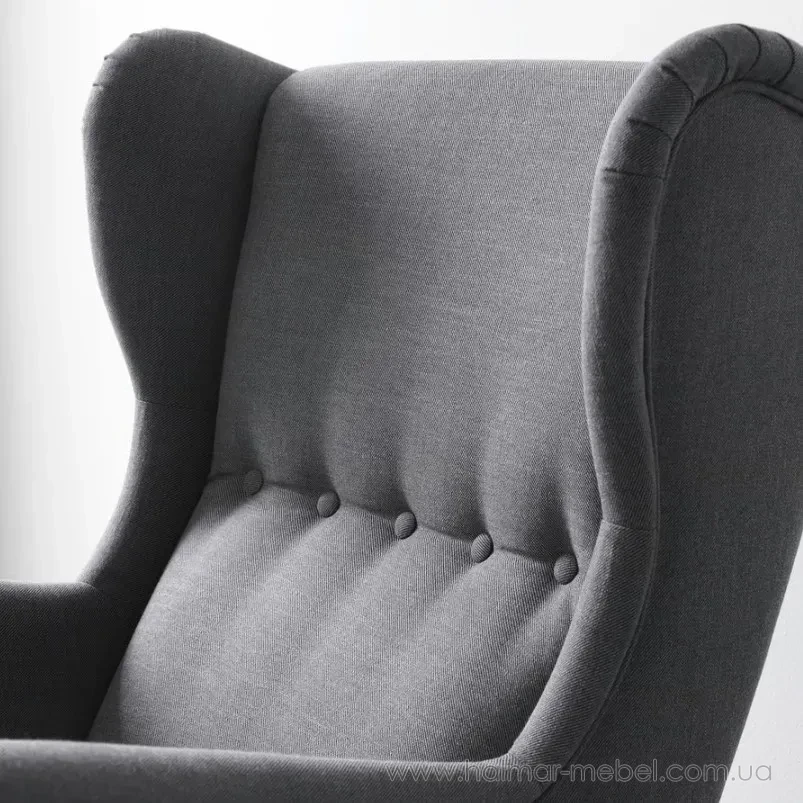 Крісло STRANDMON IKEA темно-сірий - приваблива модель в класичному стилі. Конструкція крісла включає в себе каркас на дерев'яних ніжках, м'яке сидіння, високу спинку та зручні підлокітники. В якості оббивки використана тканина Nordvalla темно-сірого кольору.