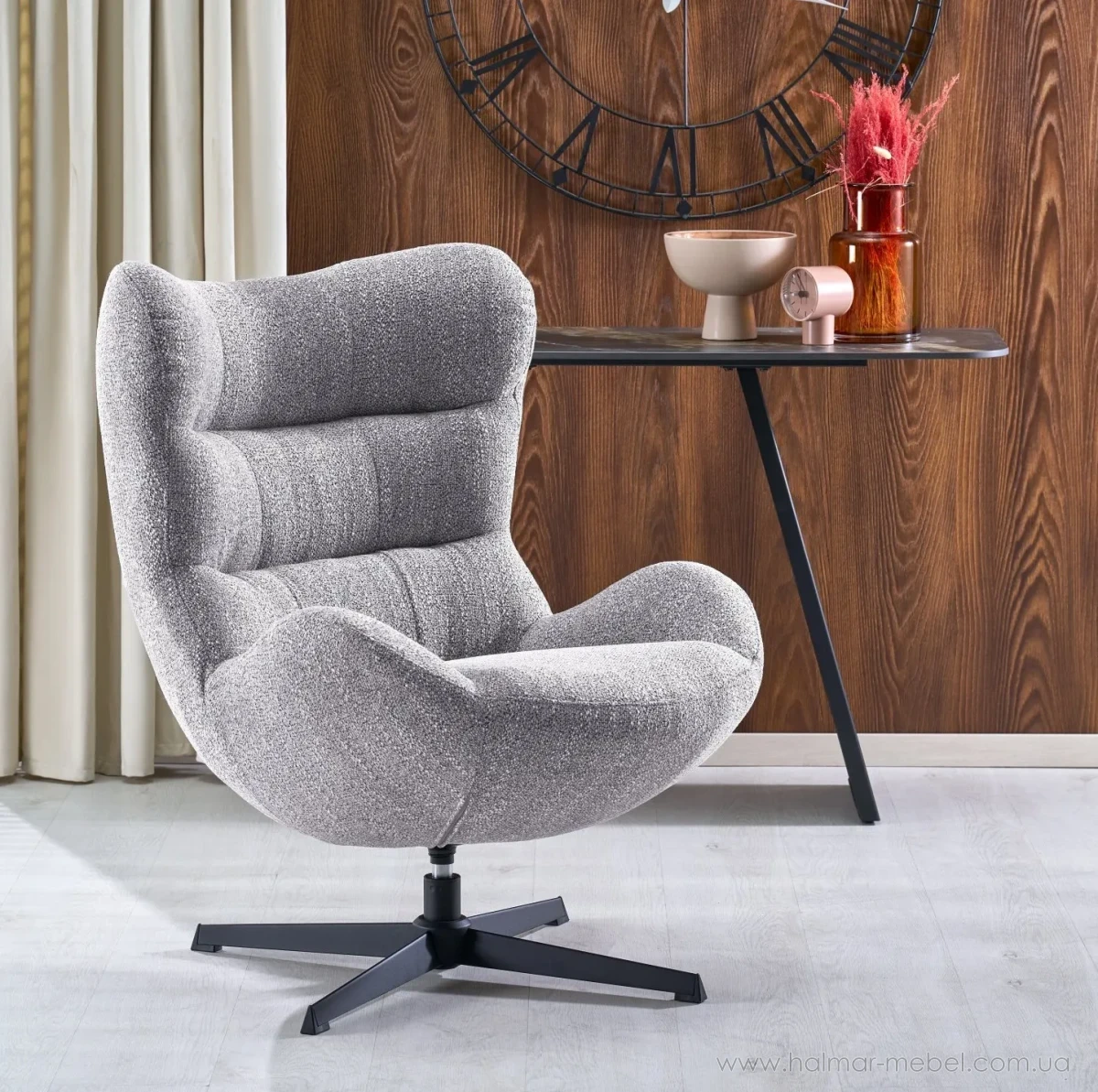 Крісло поворотне JACKIE HALMAR сірий - стильна новинка 2026 для комфортного відпочинку. Конструкція крісла складається із сталевого каркаса та м'якого зручного сидіння з високою спинкою. Як оббивка використана тканина AMICASA 09 сірого кольору. Функціональною особливістю цієї моделі є функція повороту сидіння.
