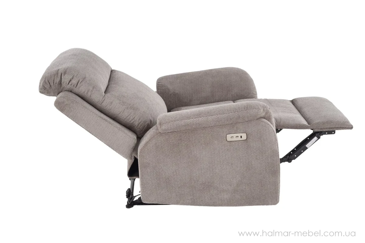 Крісло-реклайнер GALEON HALMAR сірий - приваблива новинка з електроприводом розкладання. Це ідеальна модель для комфортного відпочинку. Як оббивка використана тканина VINCI сірого кольору.