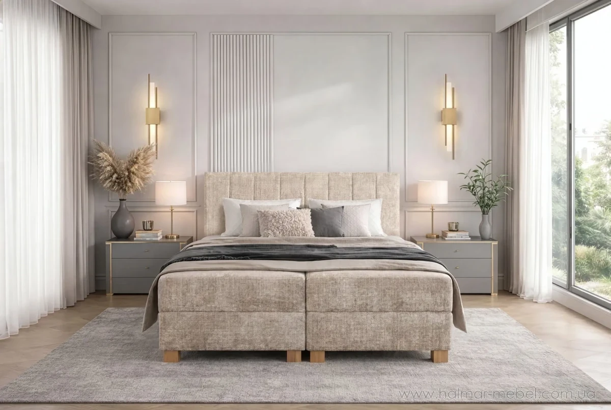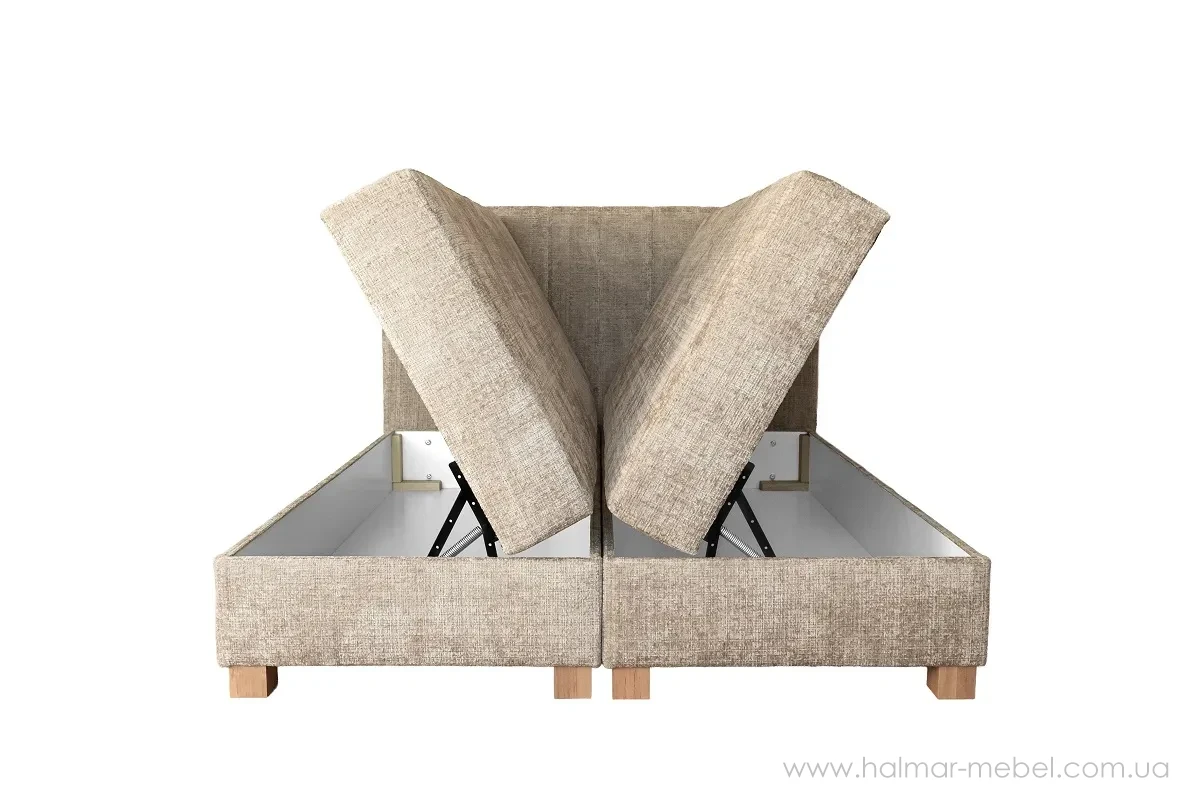Ліжко LARGO 160 HALMAR бежевий - новинка 2026 року для сучасної спальні. Континентальне ліжко з вбудованим матрацом та двома контейнерами для постільної білизни привертає увагу функціональним дизайном та створене для вашого комфорту.