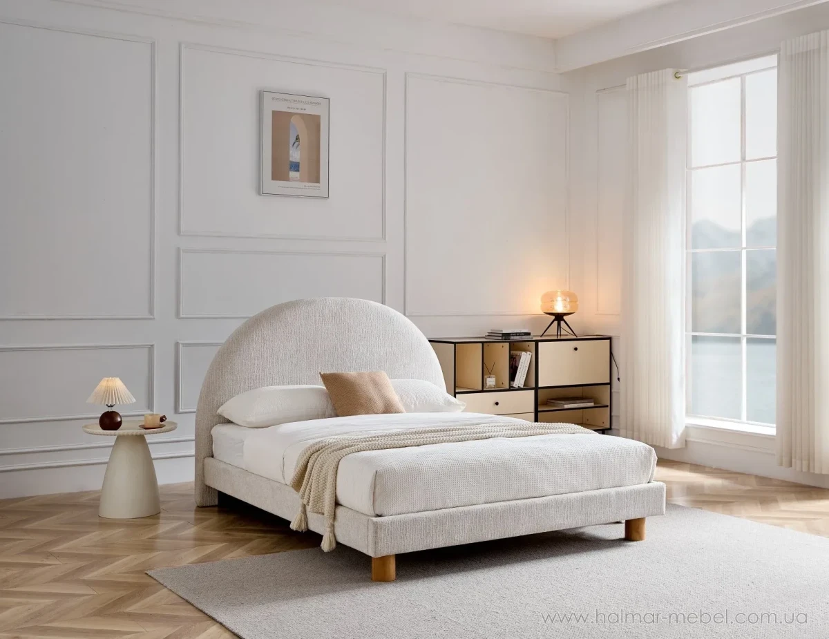Ліжко TURI 160 HALMAR світло-бежевий – елегантна новинка 2026 року для інтер'єру сучасної спальні. Конструкція ліжка включає дерев'яну основу з ортопедичними ламелями, а також узголів'я оригінальної форми з оббивкою з тканини світло-бежевого кольору.