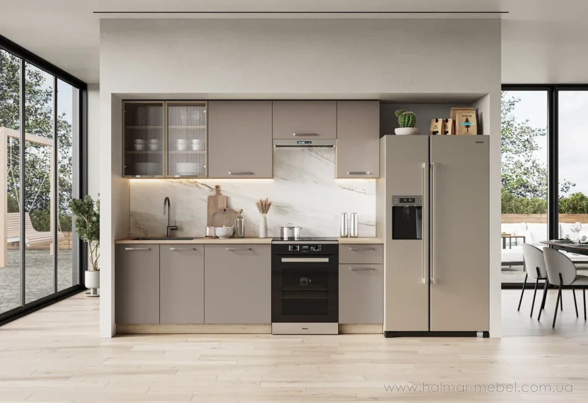 Кухня ALICANTE 240 HALMAR дуб кремона/бежевий - елегантна новинка 2026 року для сучасної кухні. Корпус та фасади виготовлені в кольорі дуб кремона/бежевий, стільниця товщиною 2.8 cм кольору дуб кремона.