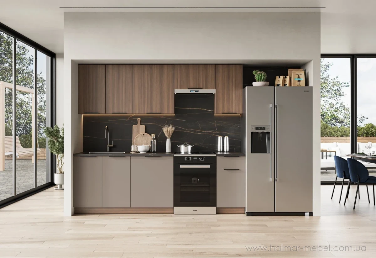 Кухня GRENADA 240 HALMAR горіх/коричневий - стильна новинка 2026 року для сучасної кухні. Корпус та фасади виготовлені в кольорі дуб горіх/коричневий, стільниця товщиною 2.8 cм кольору чорний мармур.