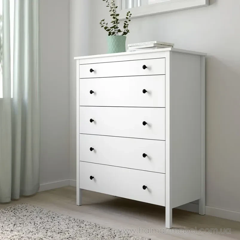 Комод 5ш KOPPANG IKEA 90х114 білий - елегантна та функціональна модель, яка знайде своє місце у будь-якому інтер'єрі та допоможе в організації зберігання особистих речей. Конструкція комода складається з корпусу на ніжках та 5-и висувних шухляд.