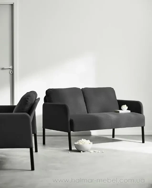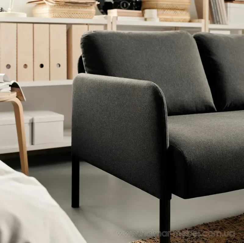 Диван 2-місний GLOSTAD IKEA темно-сірий - стильна пропозиція, яка дозволяє оформити комфортний куточок відпочинку у вашому будинку або офісі. Його конструкція складається із сталевого каркасу, м'якого сидіння та зручної спинки з оббивкою із міцної тканини темно-сірого кольору. Завдяки невеликій вазі, диван легко можна переміщати в приміщенні. Поверхні легко очищаються від пилу та можливих забруднень.