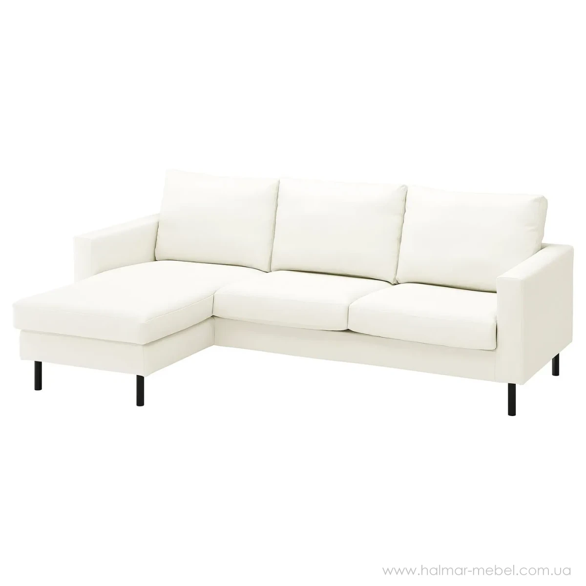 Диван 3-місний з шезлонгом SALTSJÖBADEN IKEA білий - ефектна та зручна 3-місна модель для домашнього або комерційного приміщення. Конструкція дивана не розкладна, включає невеликі сталеві ніжки, м'яке сидіння зі спинкою, шезлонгом та підлокітниками. Шезлонг можна встановити зліва або справа, що дуже зручно при облаштуванні інтер'єру. Як оббивка використана тканина Blekinge білого кольору. Чохол можна зняти та прати в автоматичному режимі.