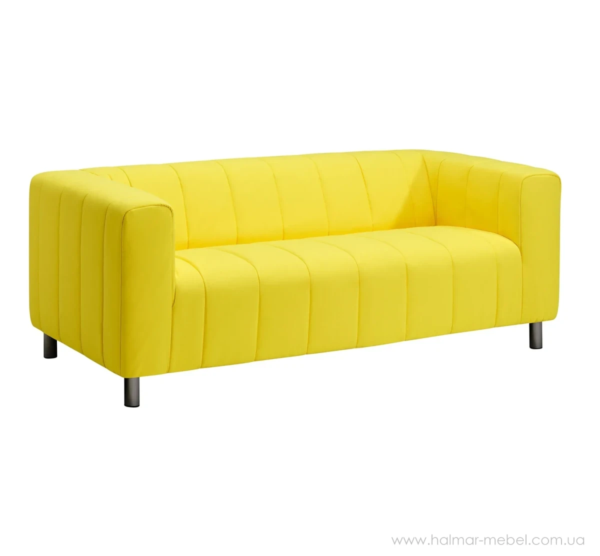 Диван KLIPPAN IKEA яскраво-жовтий - ефектна та зручна 2-місна модель для сучасного інтер'єру. Конструкція нерозкладного дивана включає невеликі сталеві ніжки, м'яке сидіння зі спинкою і підлокітниками. Як оббивка використана тканина Långban яскраво-жовтого кольору. Поверхня міцна, стійка до стирання та вигоряння, проста у догляді. Чохол можна зняти та прати в автоматичному режимі.