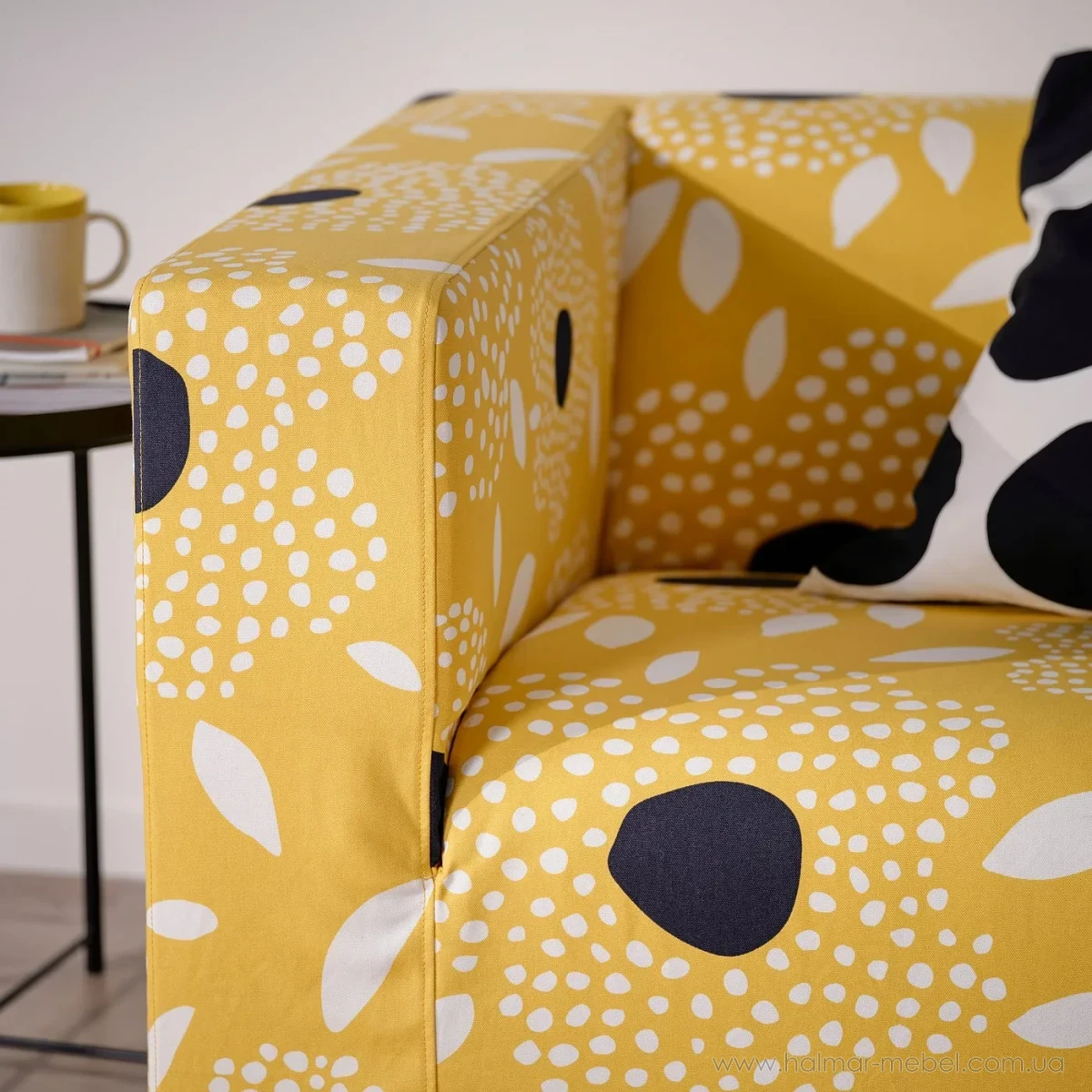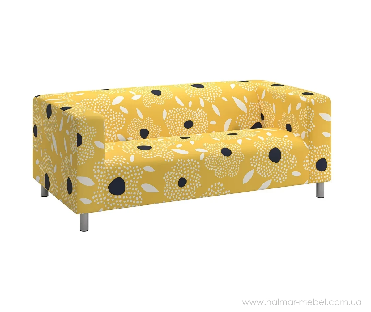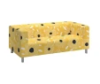Диван KLIPPAN IKEA жовтий принт квіти - ефектна та зручна 2-місна модель для сучасного інтер'єру. Конструкція нерозкладного дивана включає невеликі сталеві ніжки, м'яке сидіння зі спинкою і підлокітниками. Як оббивка використана тканина Tingetorp жовтого кольру з квітами. Поверхня міцна, стійка до стирання та вигоряння, проста у догляді. Чохол можна зняти та прати в автоматичному режимі.