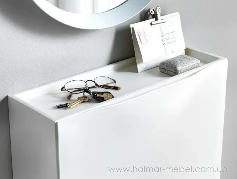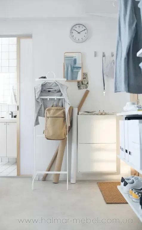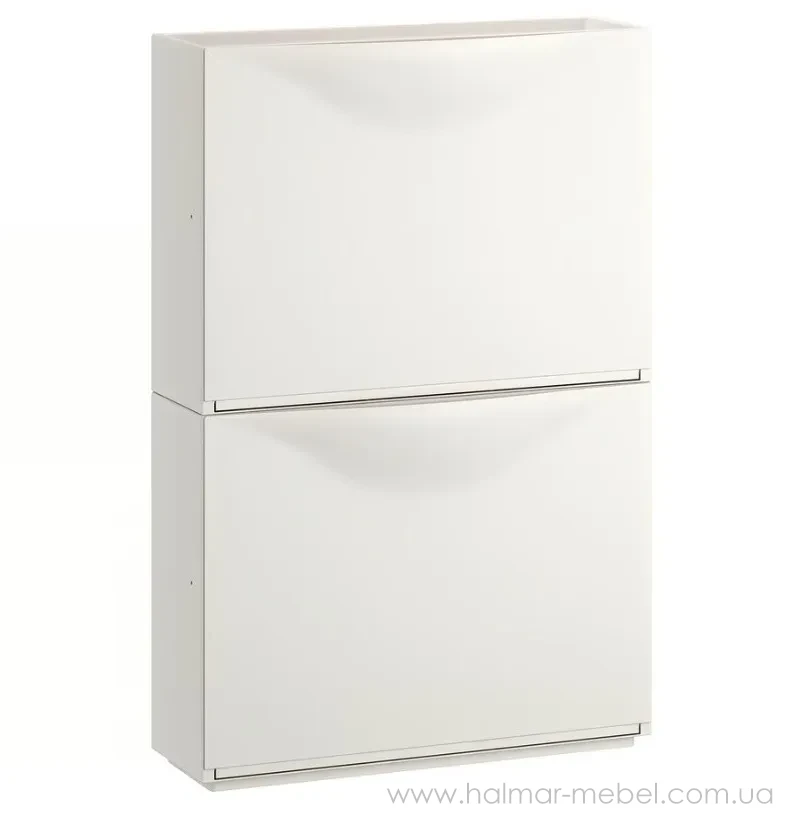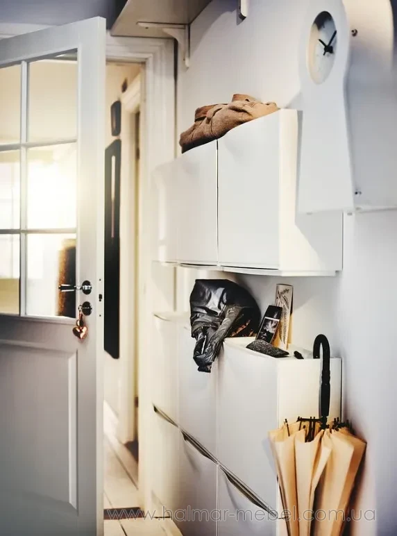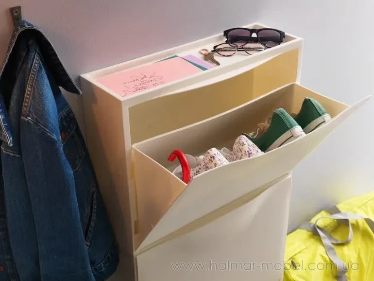 Тумба для взуття TRONES IKEA білий - стильна та практична пропозиція для невеликого приміщення. Модульні елементи квадратної форми, плоскі та компактні, кріпляться до стіни і дозволяють оптимально задіяти навіть невеликі ділянки передпокою та коридору. У комплект входить два модулі, кожен розрахований на зберігання 2-х пар взуття, а також підходить для аксесуарів (шарфів, рукавичок) та інших корисних дрібниць. Конструкція тумби для взуття виготовлена із поліпропілену, поверхні легко очищаються від пилу та забруднень.