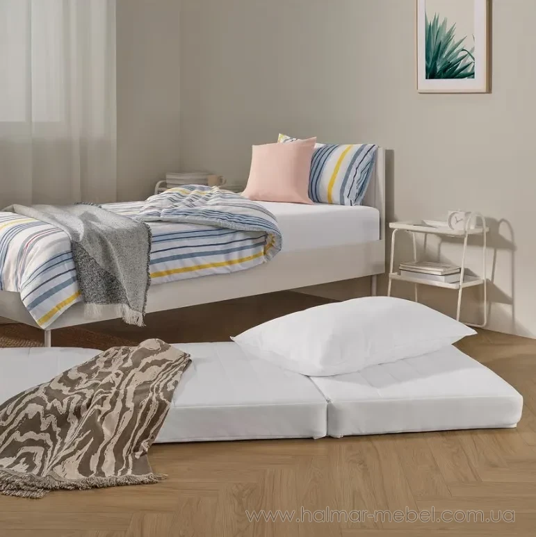 Матрац/пуф VITHÄLL IKEA сірий - функціональна пропозиція, яка вдало поєднує три функції і знайде своє застосування в будь-якому будинку.VITHÄLL IKEA це зручний пуф, підставка під ноги та, при необхідності, розкладне спальне місце для гостей. Пружини, розташовані під шаром м'якої піни, забезпечують комфортний відпочинок. Тут все продумано до дрібниць: приємно користуватися, легко розкладати, зберігати та обслуговувати (знімний чохол можна прати в автоматичному режимі).