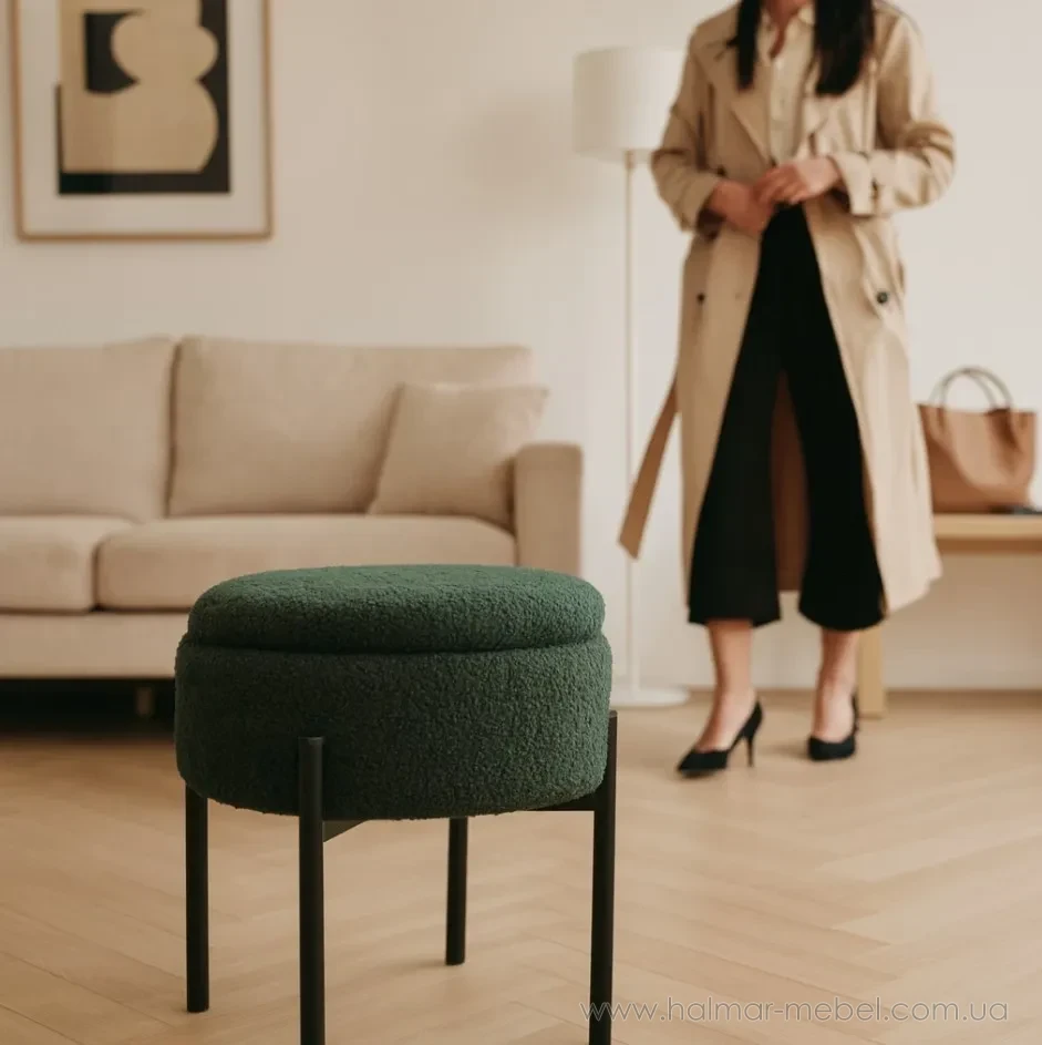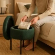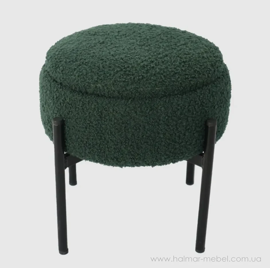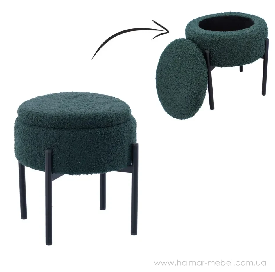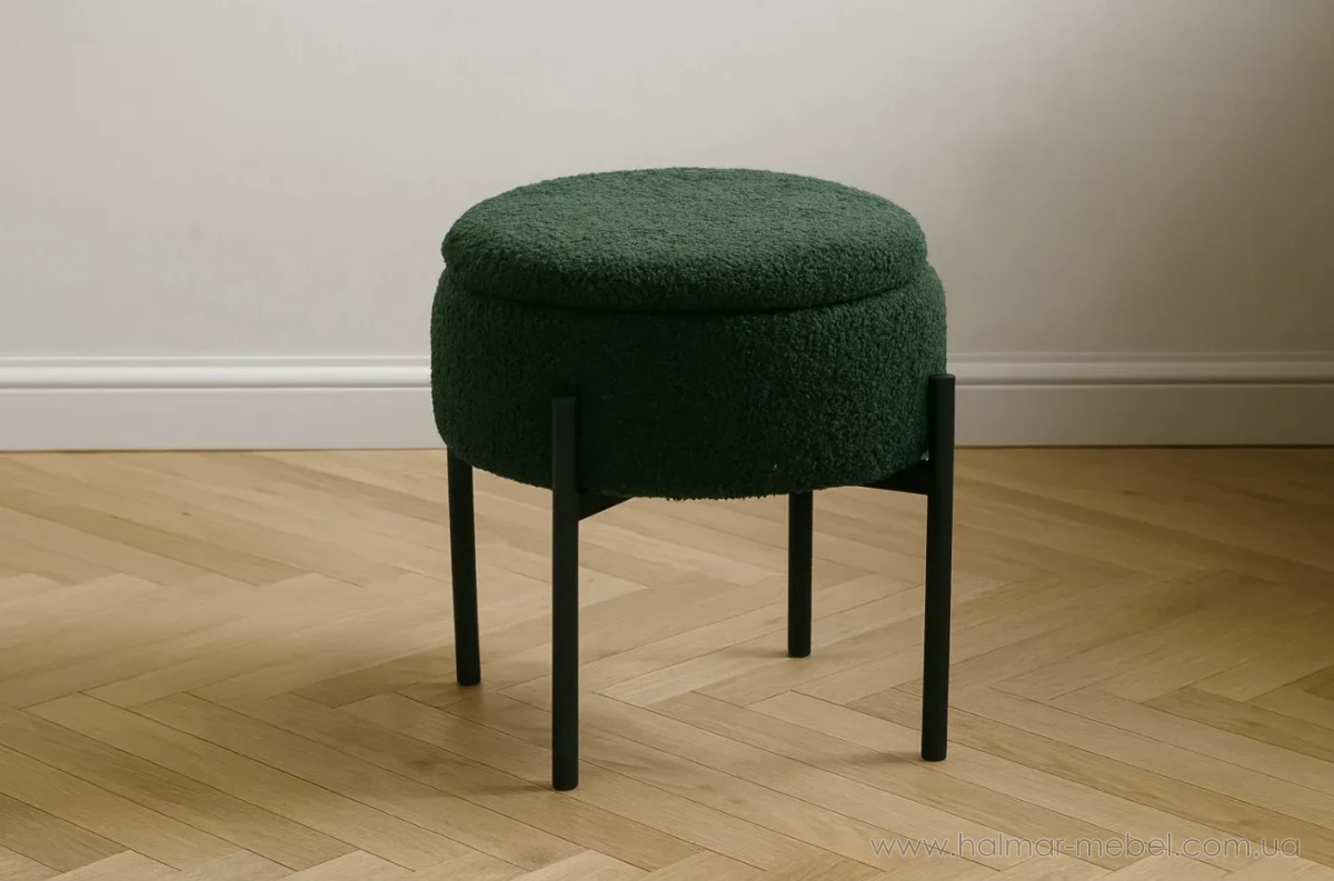 Пуф округлий з контейнером CHOMIK зелений/чорний - стильна новинка для сучасного інтер'єру. Його конструкція складається з міцного металевого каркаса чорного кольору і м'якого сидіння з оббивкою з тканини зеленого кольору. Функціональною особливістю моделі є наявність невеликого контейнера для зберігання корисних дрібниць.