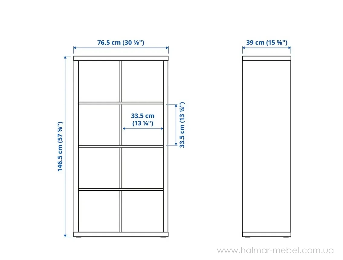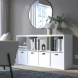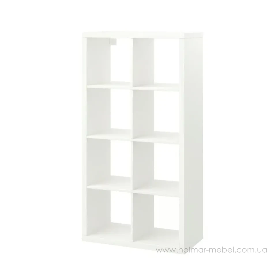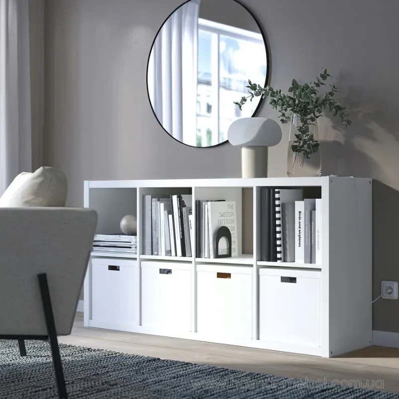 Стелаж KALLAX 77х147 IKEA білий - популярний елемент інтер'єру для зберігання книг і предметів декору. Його конструкція складається з корпусу прямокутної форми з квадратними комірками всередині (розмір 33.5х33.5 см). Стелаж можна використовувати вертикально або горизонтально, як пристінну конструкцію, так і для зонування простору.
