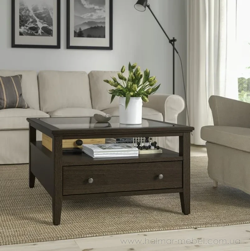 Стіл журнальний IDANÄS IKEA темно-коричневий - приваблива та функціональна модель, яка вдало доповнить як класичний, так і сучасний інтер'єр. Конструкція столика складається з дерев'яного каркасу, прозорої скляної стільниці та корпусу з шухлядою.