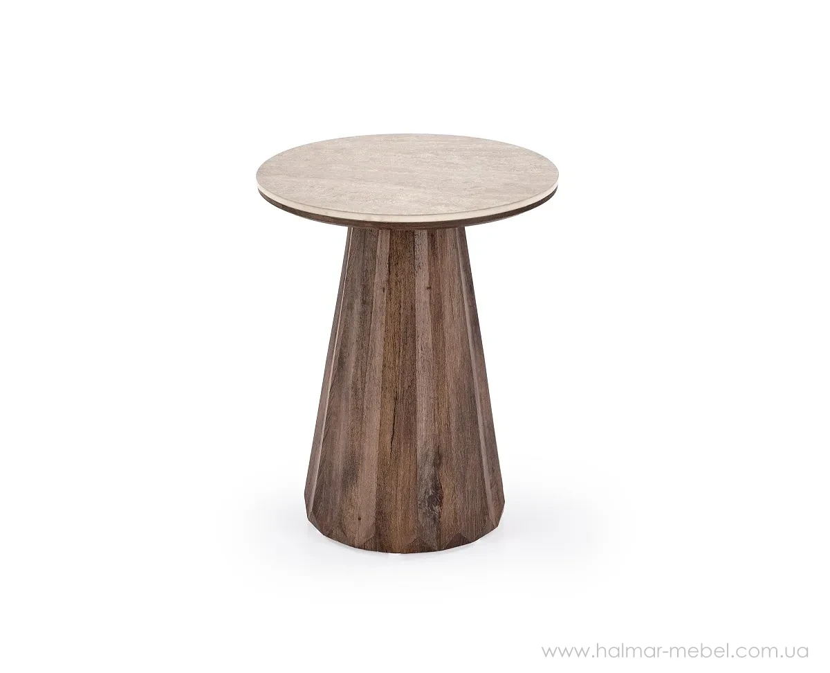 Стіл журнальний DIAVOLA S HALMAR травертін/горіх - цікава новинка 2026 року для сучасного інтер'єру. Конструкція столика складається з каркасу в кольорі горіх та круглої керамічної стільниці в кольорі світлого каменю.
