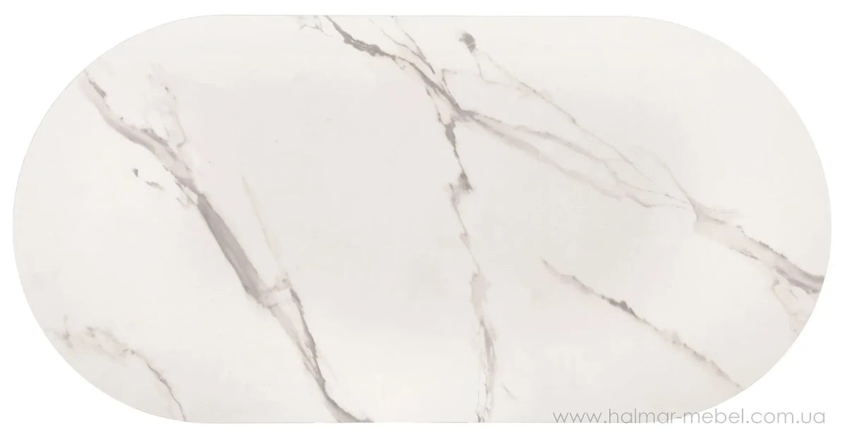 Стіл журнальний KALUA HALMAR білий мармур/золотий - елегантна новинка 2026 року для сучасного інтер'єру. Конструкція столика включає в себе сталевий каркас золотого кольору, овальну стільницю та полицю з ламінованої МДФ з ефектом білого мармуру.