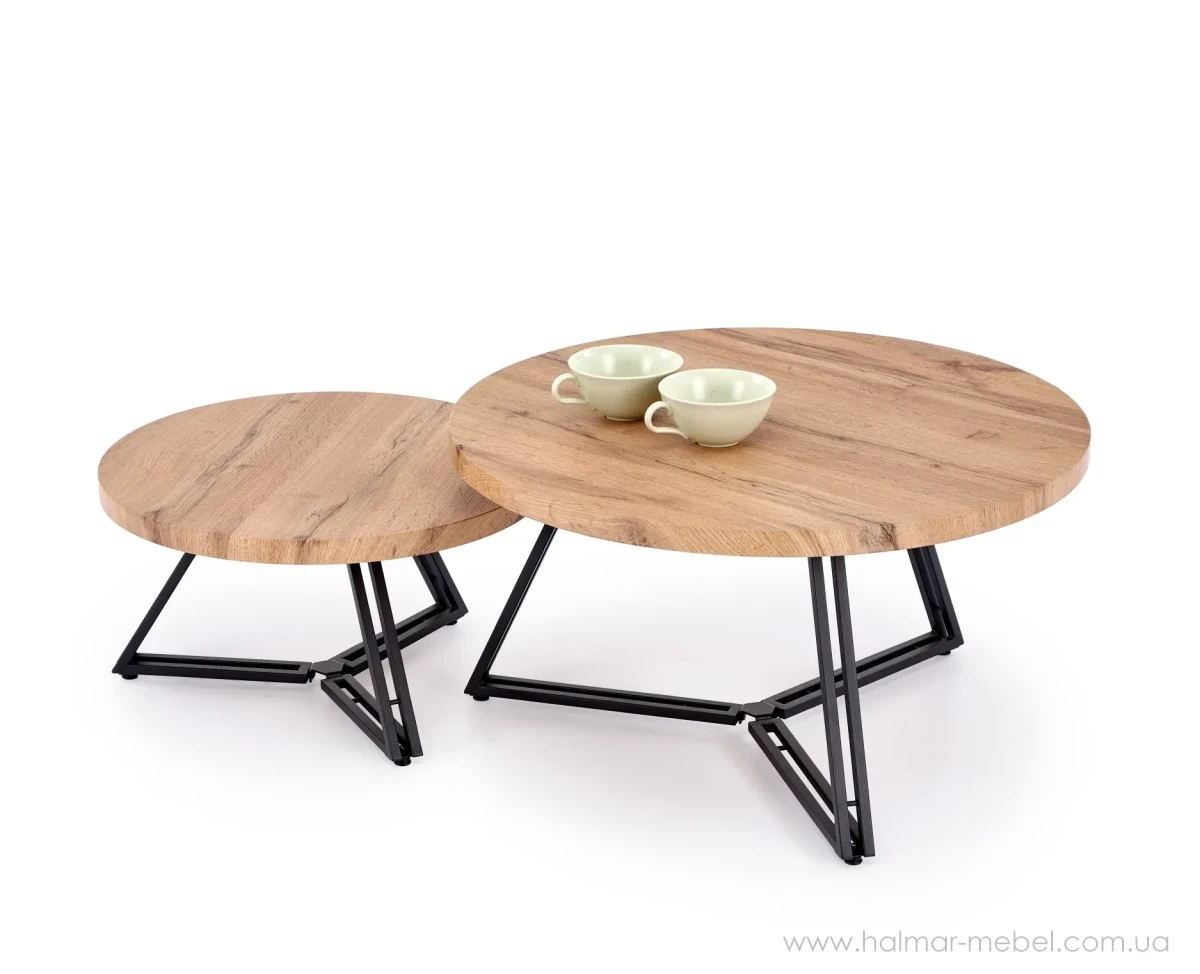 Стіл журнальний комплект ANGER HALMAR дуб золотий/чорний - приваблива новинка для сучасного інтер'єру. В комплекті 2 столика, конструкція кожного складається зі сталевого каркасу та круглої стільниці з ламінованої МДФ в кольорі дуб золотий.