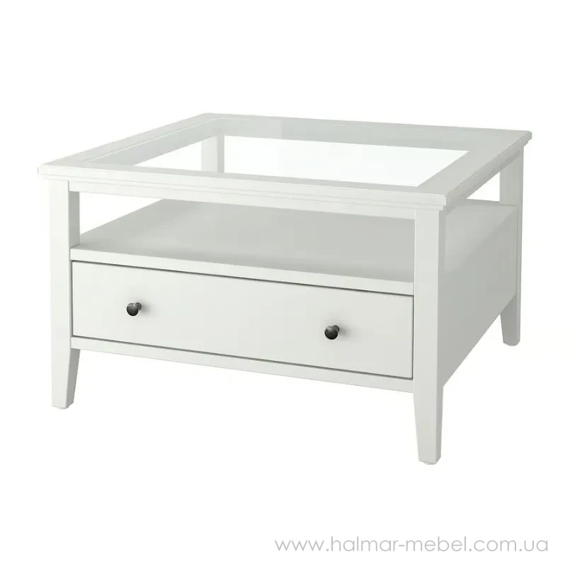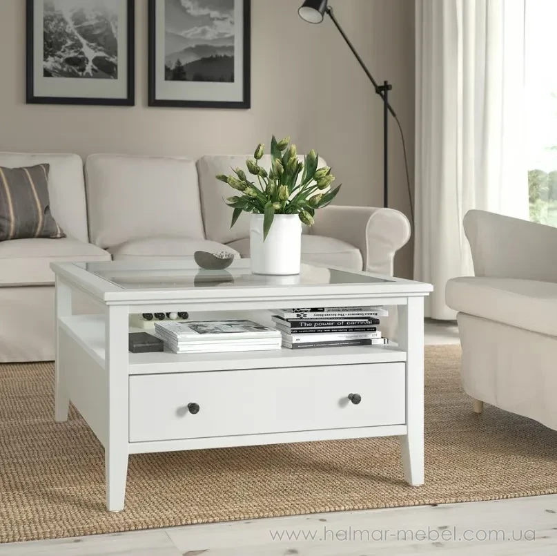 Стіл журнальний IDANÄS IKEA білий - приваблива та функціональна модель, яка вдало доповнить як класичний, так і сучасний інтер'єр. Конструкція столика складається з дерев'яного каркасу, прозорої скляної стільниці та корпусу з шухлядою.
