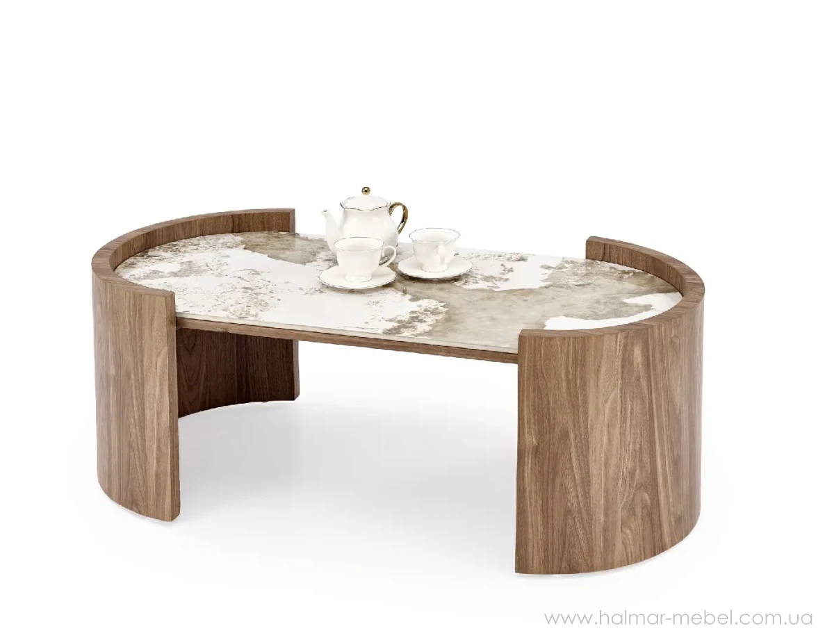 Стіл журнальний NICOSIA HALMAR бежевий мармур/світлий горіх – ефектна новинка 2026 для сучасного інтер'єру. Стіл привертає увагу оригінальним та якісним виконанням. Його конструкція складається з каркасу у вигляді двох округлих поверхонь кольору світлий горіх та овальної керамічної стільниці з ефектом бежевого мармуру.