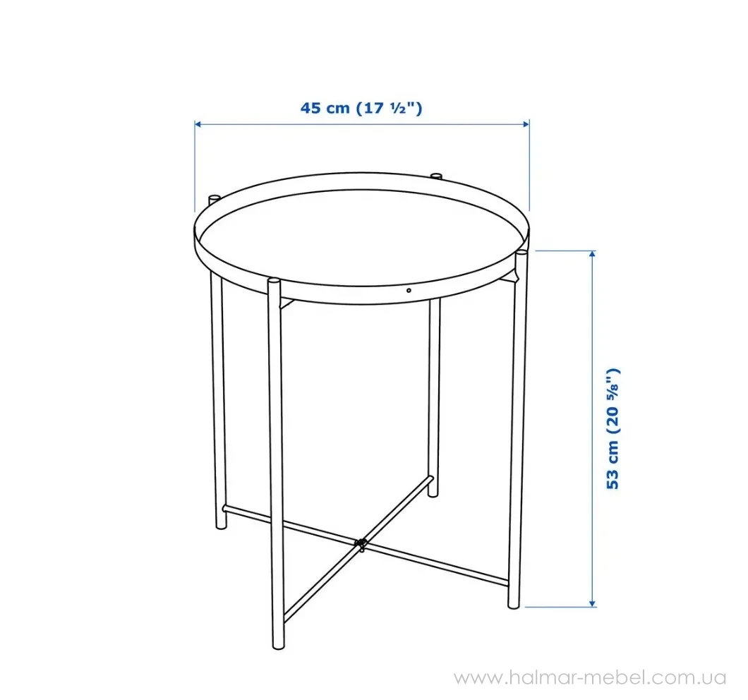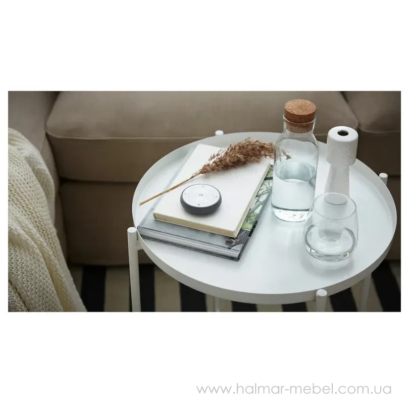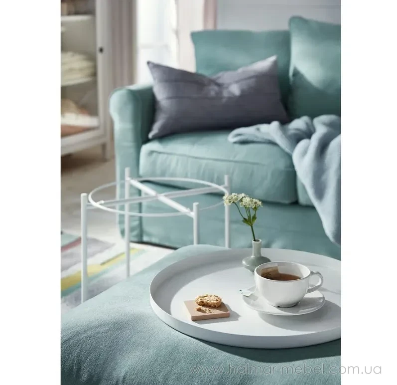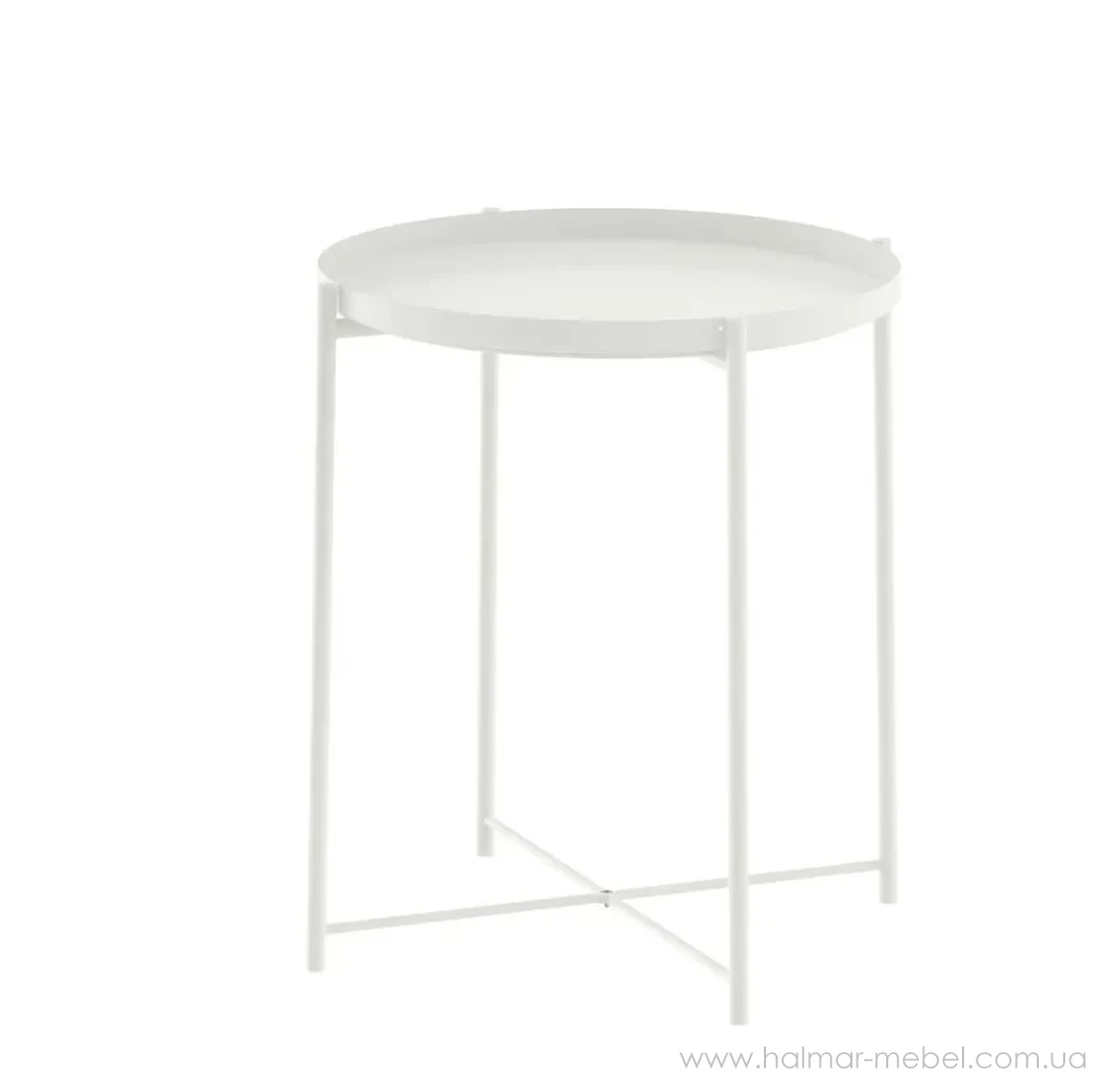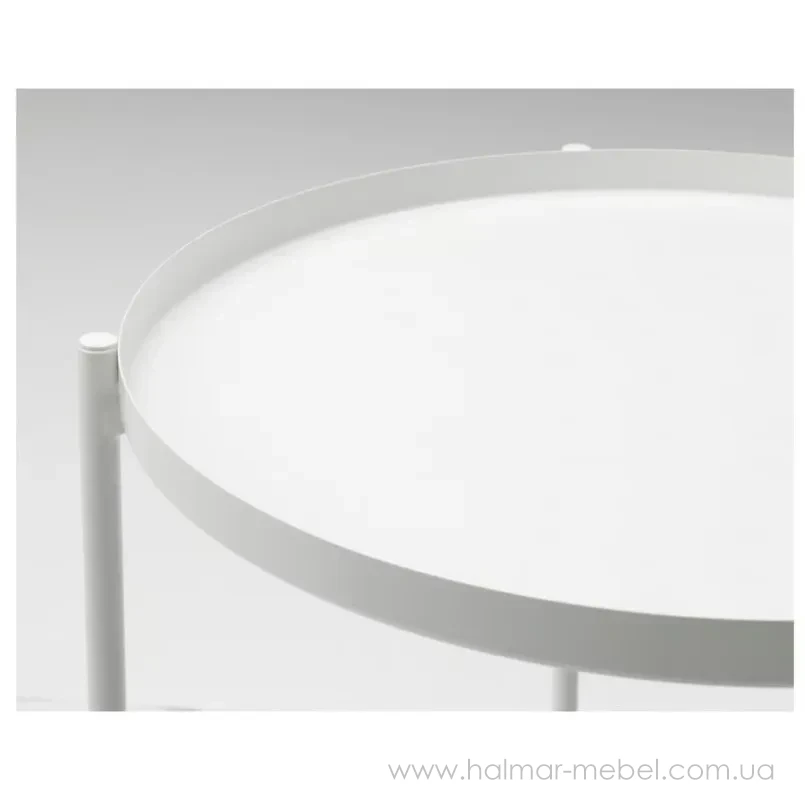 Журнальний стіл з підносом GLADOM IKEA білий - стильна і функціональна модель. Його конструкція складається з каркаса і круглої знімної стільниці, яку можна також використовувати як піднос для сервірування, а високі бортики полегшують переміщення посуду і зменшують ризик його перекидання. Широкий асортимент кольорів моделі дозволяє вибрати оптимальний варіант для вашого інтер'єру.