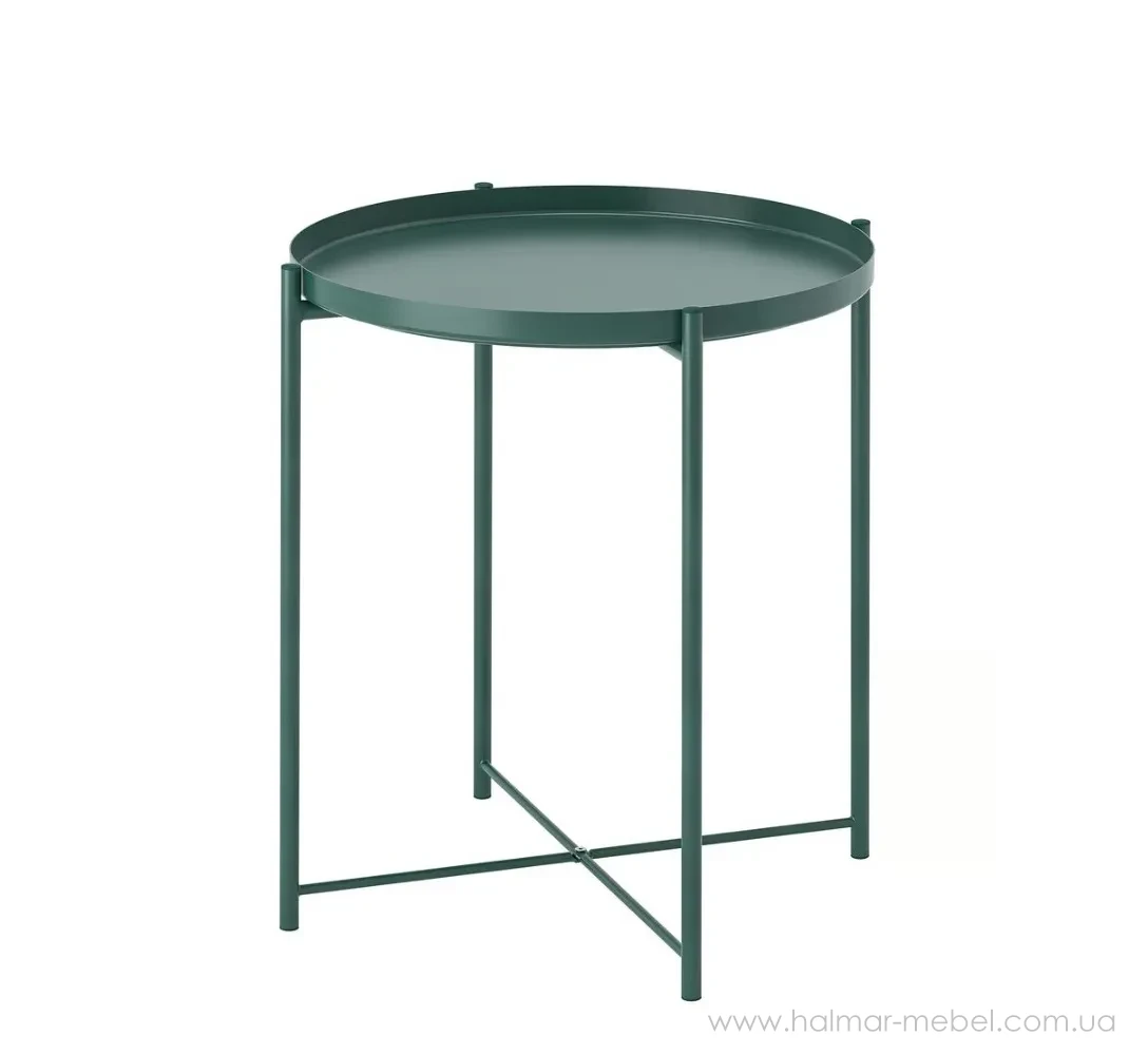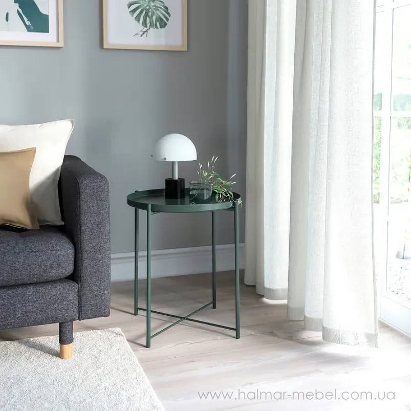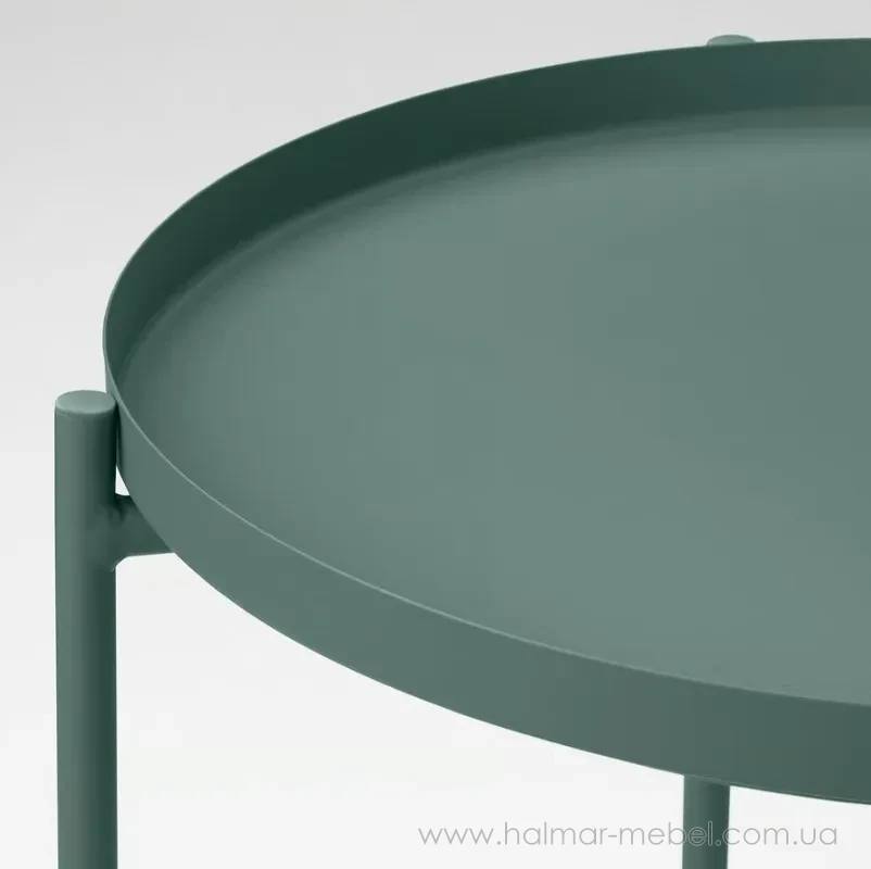 Журнальний стіл з підносом GLADOM IKEA темно-сіро-зелений - стильна і функціональна модель. Його конструкція складається з каркаса і круглої знімної стільниці, яку можна також використовувати як піднос для сервірування, а високі бортики полегшують переміщення посуду і зменшують ризик його перекидання. Широкий асортимент кольорів моделі дозволяє вибрати оптимальний варіант для вашого інтер'єру.