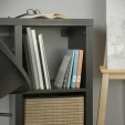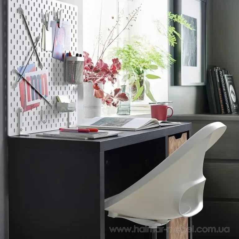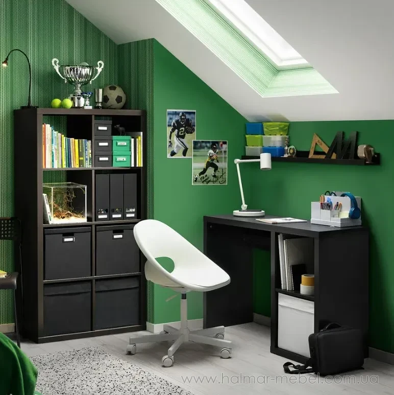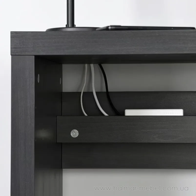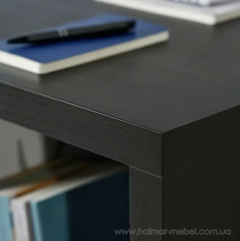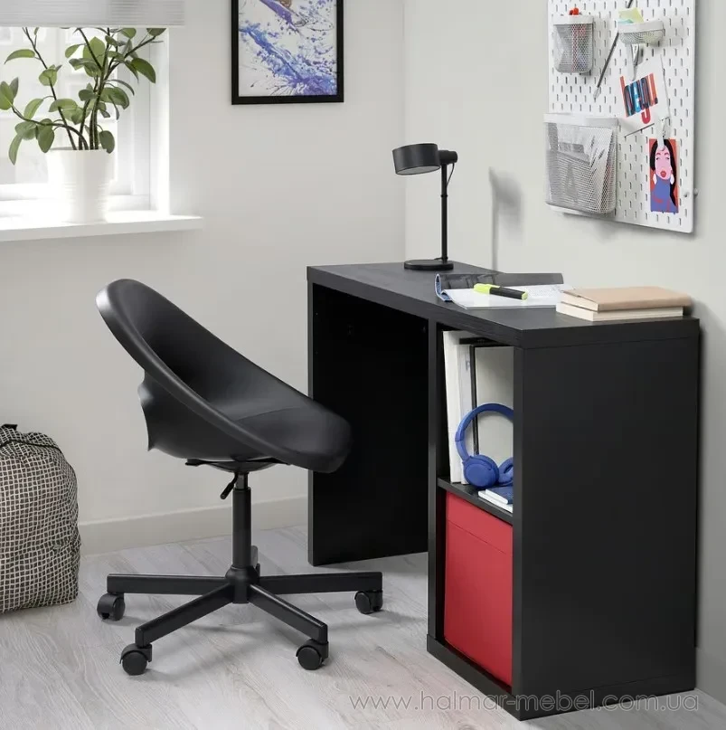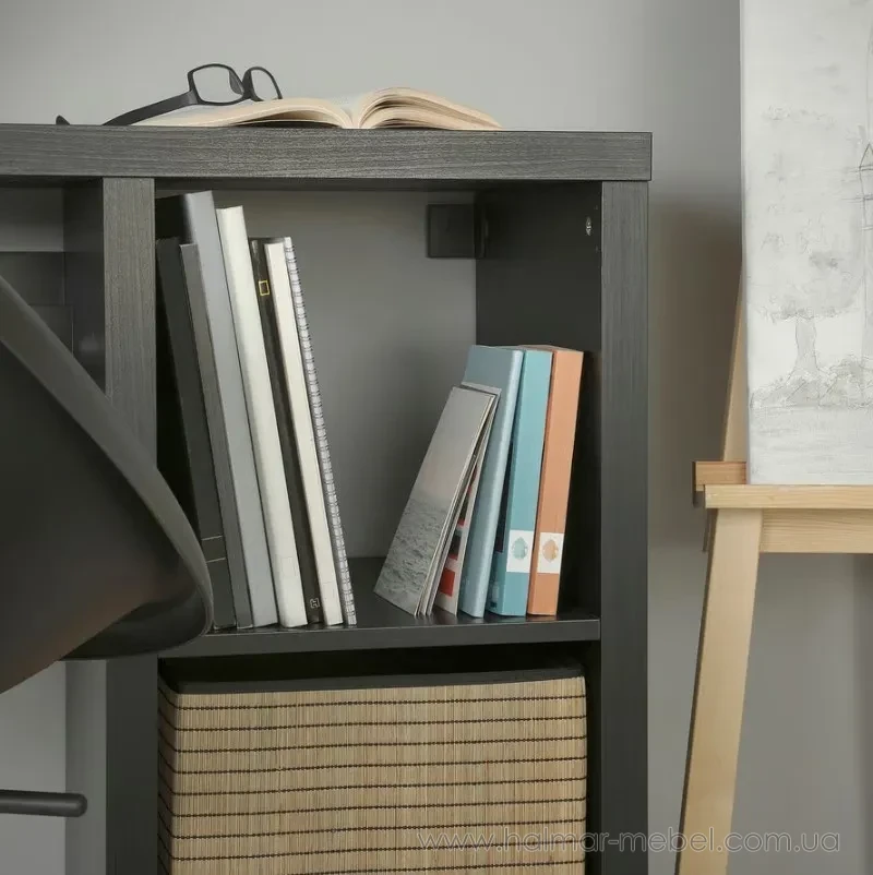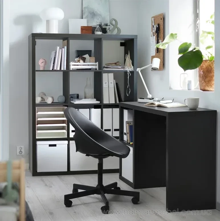 Письмовий стіл KALLAX IKEA чорно-коричневий - компактна модель для комфортної домашньої роботи та навчання, яку можна розмістити навіть у невеликому приміщенні. Конструкція столу включає в себе стільницю та стелаж з відкритими полицями. Стелаж під час складання можна встановити зліва або справа. Під стільницею є приховане місце для проводів.