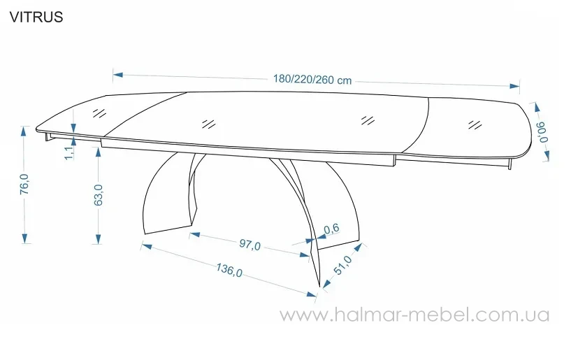 Стіл обідній розкладний VITRUS HALMAR світлий травертін - ефектна новинка 2026 року, яка гідно доповнить інтер'єр сучасної вітальні. Конструкція складається з чорного каркасу оригінальної форми та керамічної стільниці в кольорі світлого каменю. В розкладеному вигляді довжина стільниці 260 см та дозволяє розмістити 10 осіб.