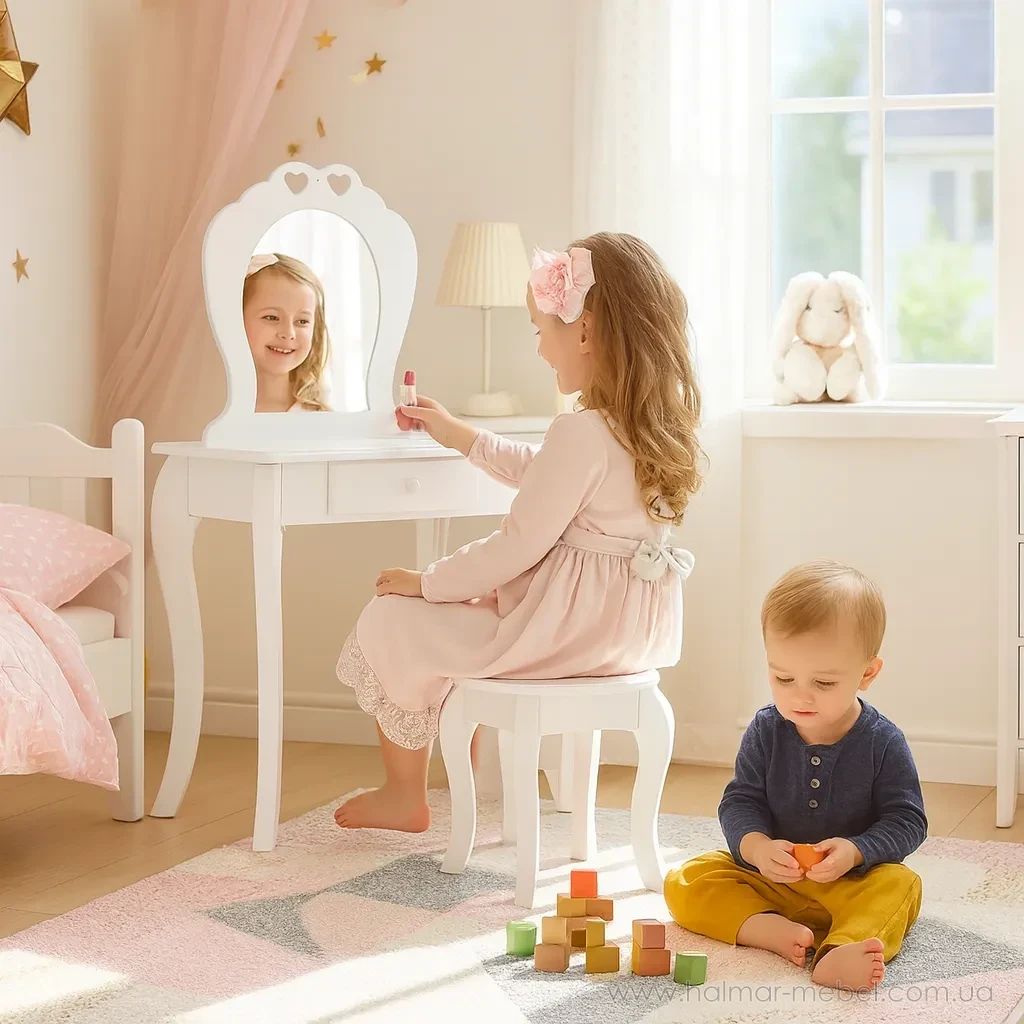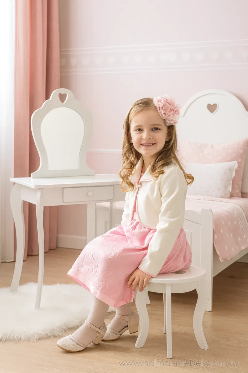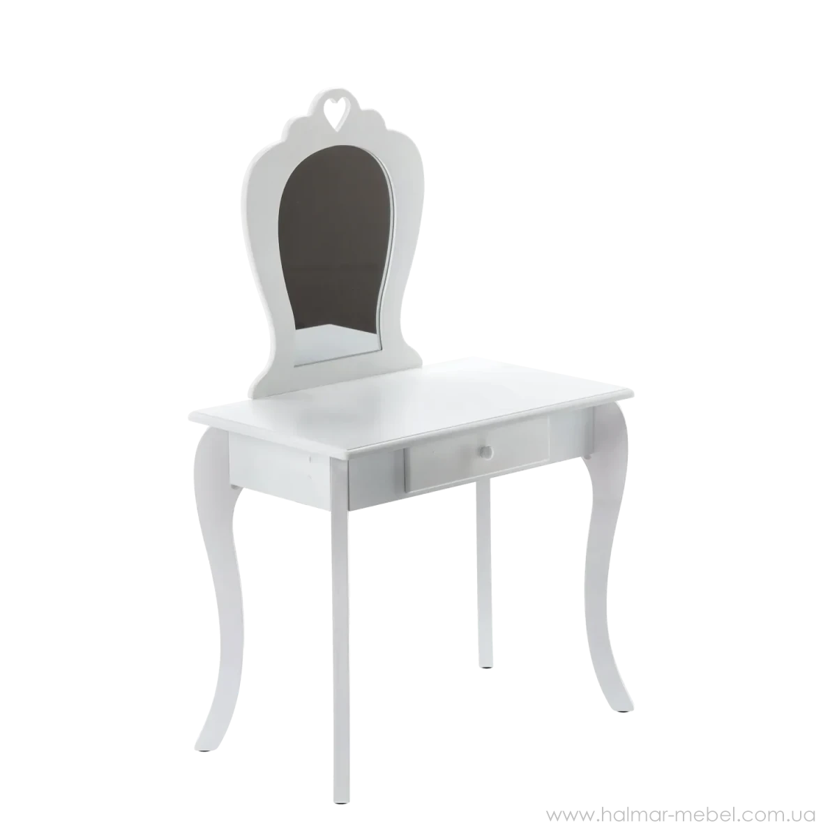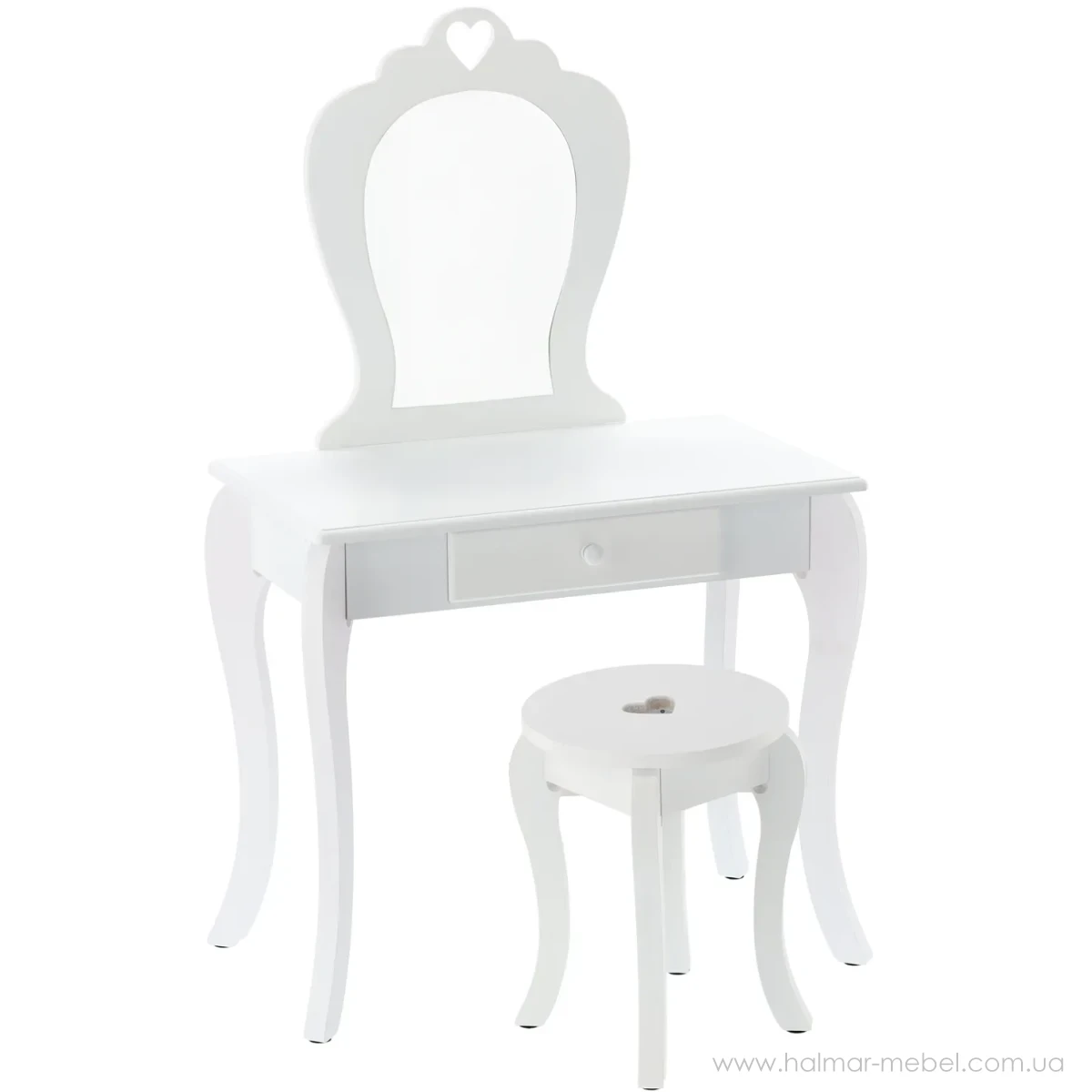 У комплект входить зручний табурет та стійкий столик, конструкція якого складається з корпусу з шухлядкою для корисних дрібничок, дзеркала в рамі та витончених ніжок.