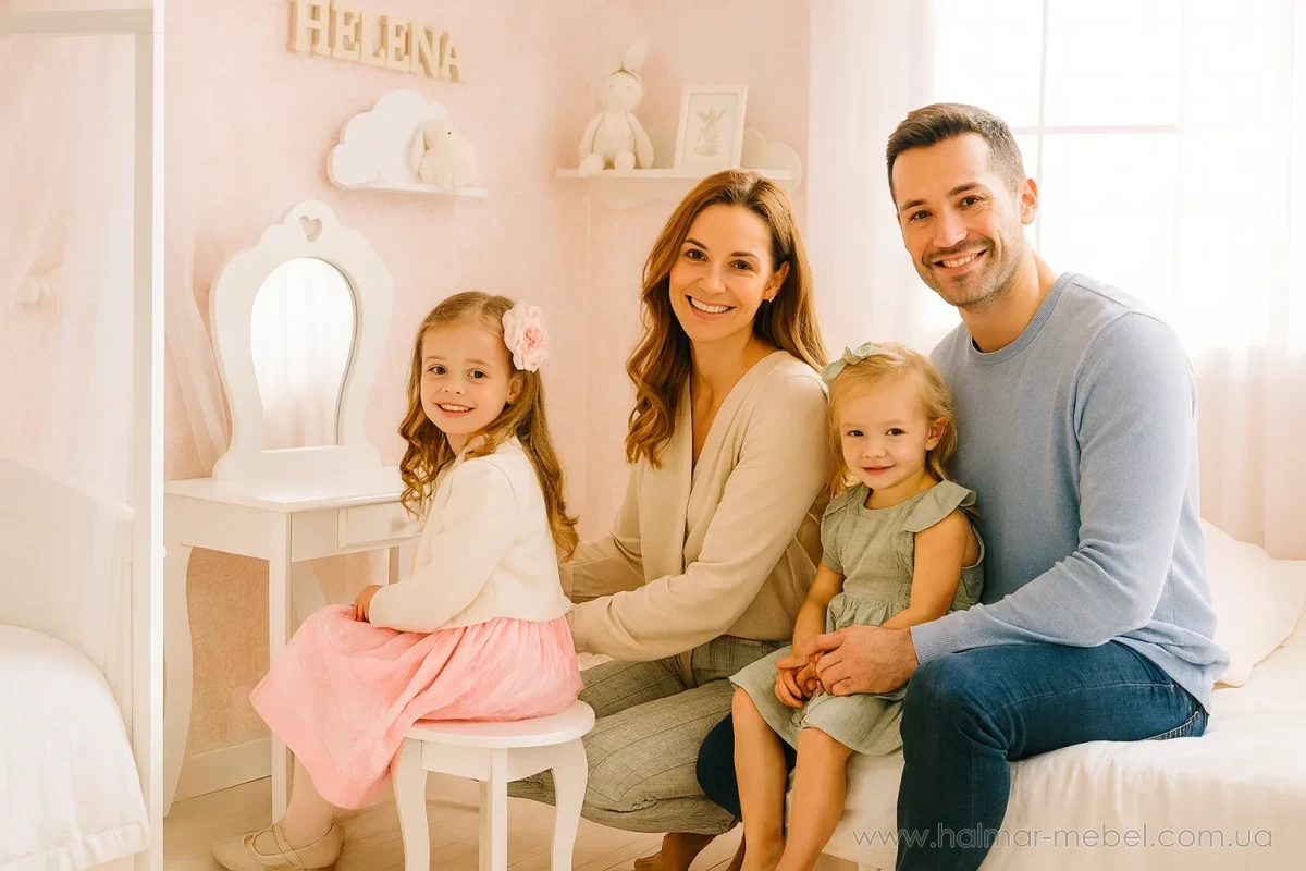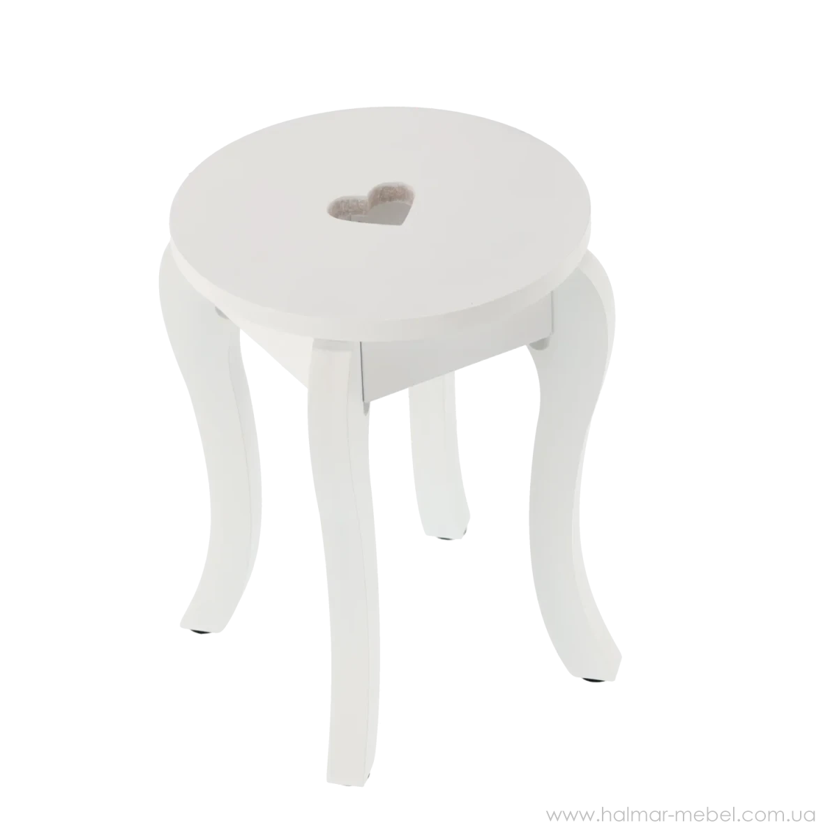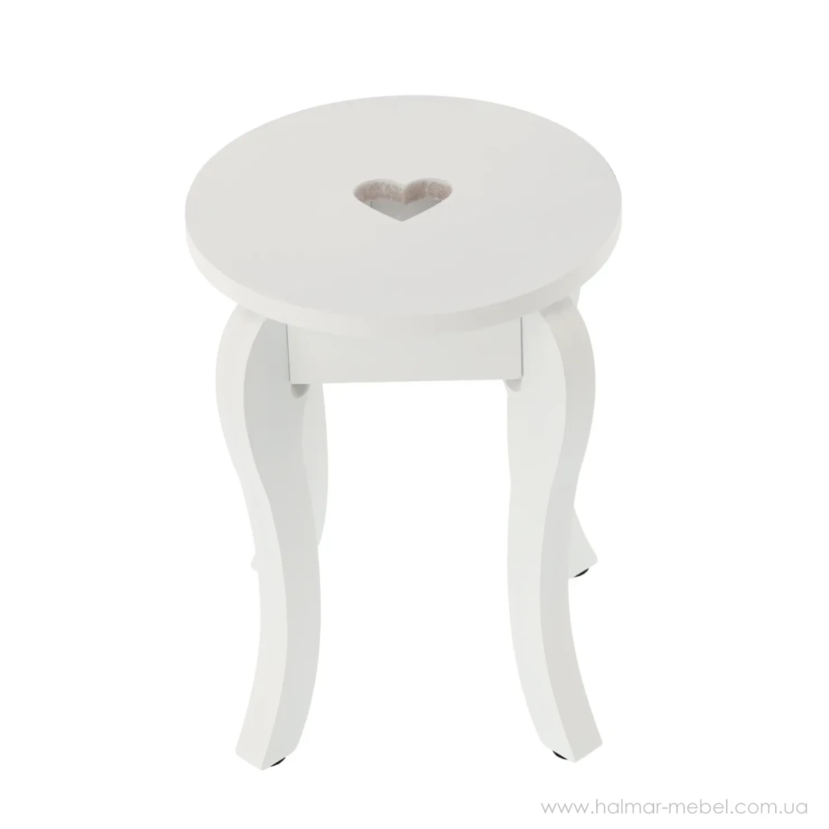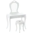 У комплект входить зручний табурет та стійкий столик, конструкція якого складається з корпусу з шухлядкою для корисних дрібничок, дзеркала в рамі та витончених ніжок.