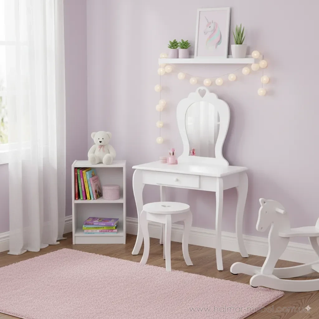 Дитячий туалетний стіл із дзеркалом та табуретом CHOMIK білий - елегантна новинка для наших маленьких користувачів. Цей комплект - пропозиція ТМ Chomik, яка поєднує стильний дизайн, надійність, функціональність і стане ідеальним доповненням в кімнаті дитини або дошкільному центрі. Туалетний столик це зручне місце для щоденних процедур догляду, а також місце для сюжетно-рольових ігор. А ще це дуже добрий подарунок!