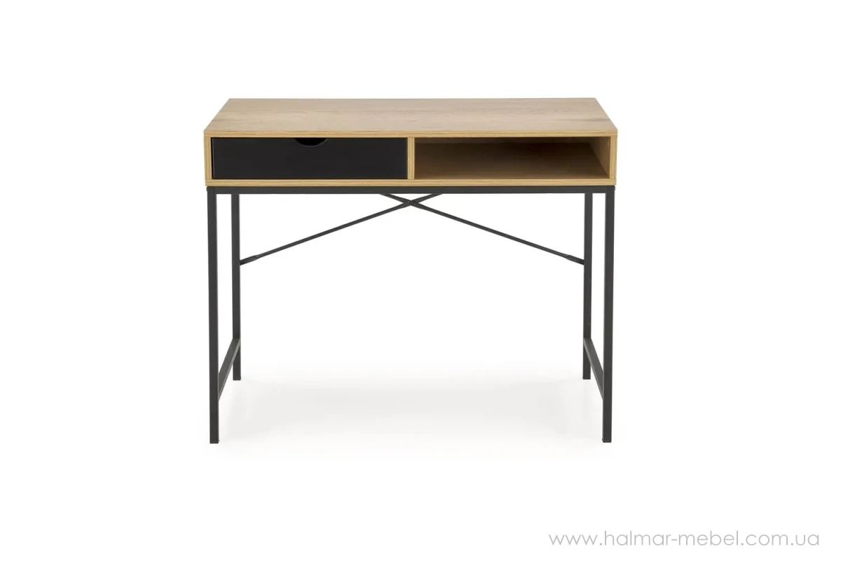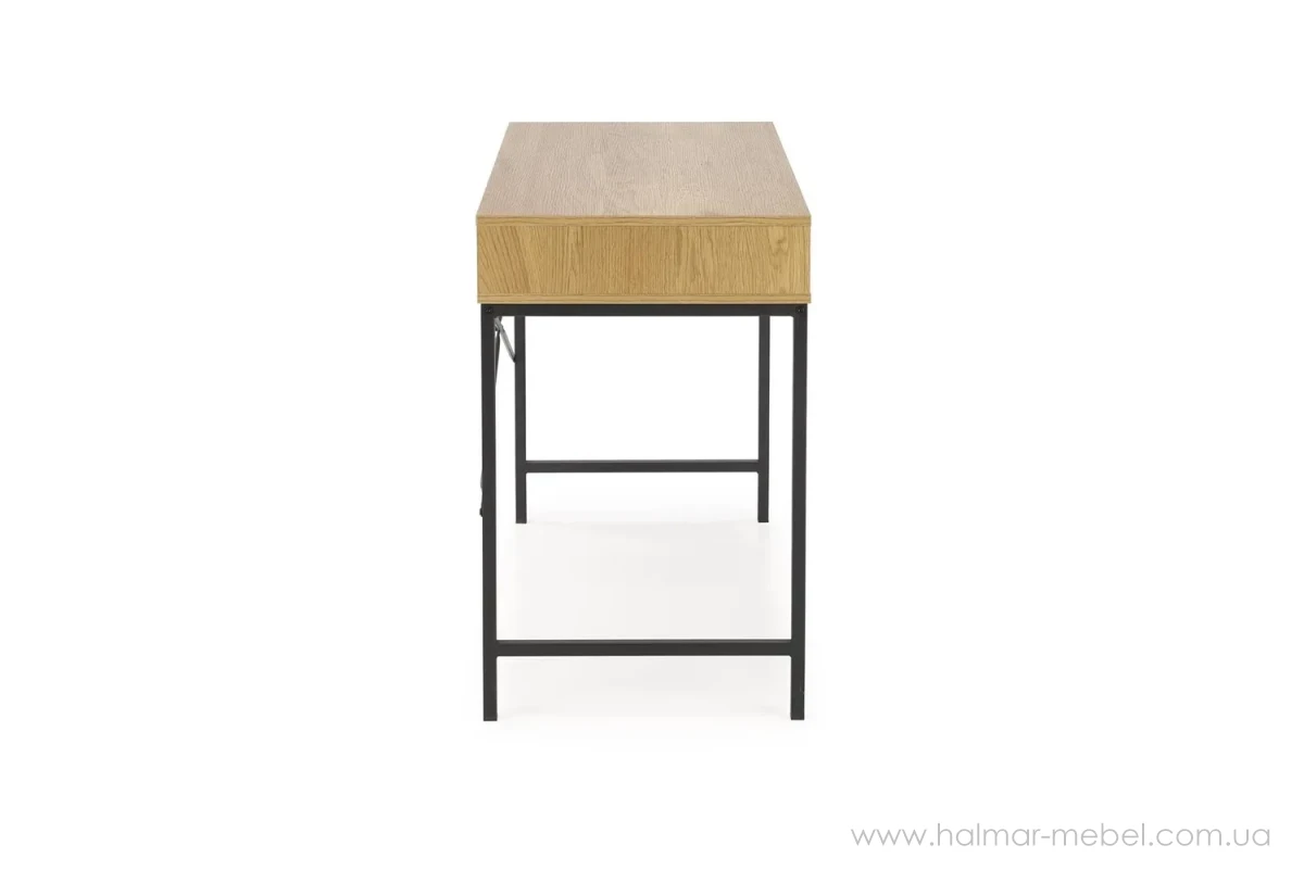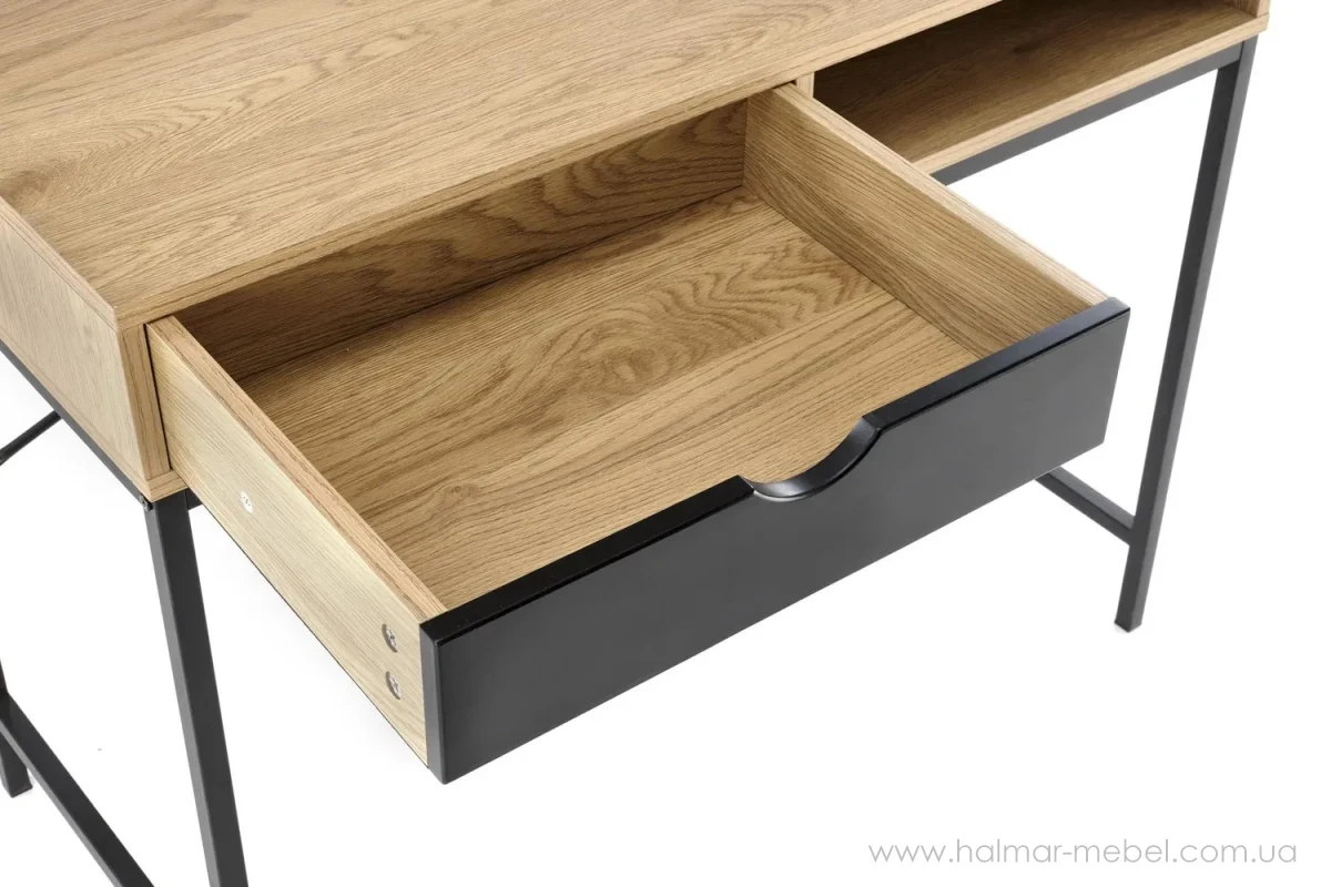 Консоль B50 Halmar – новинка 2024 року для сучасного інтер'єру. Конструкція моделі складається із сталевого каркасу чорного кольору, корпусу з прямокутною стільницею, висувною скринькою та відкритою нішою для канцелярського приладдя.