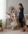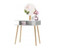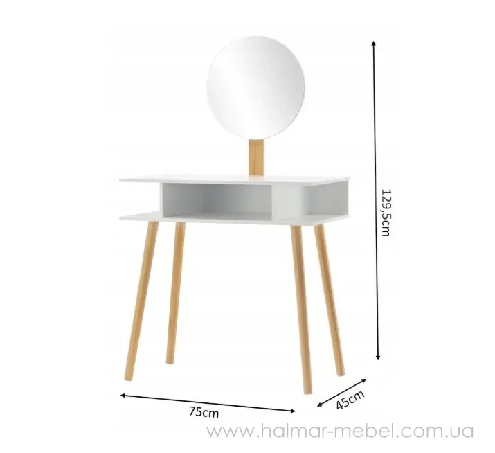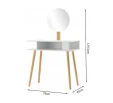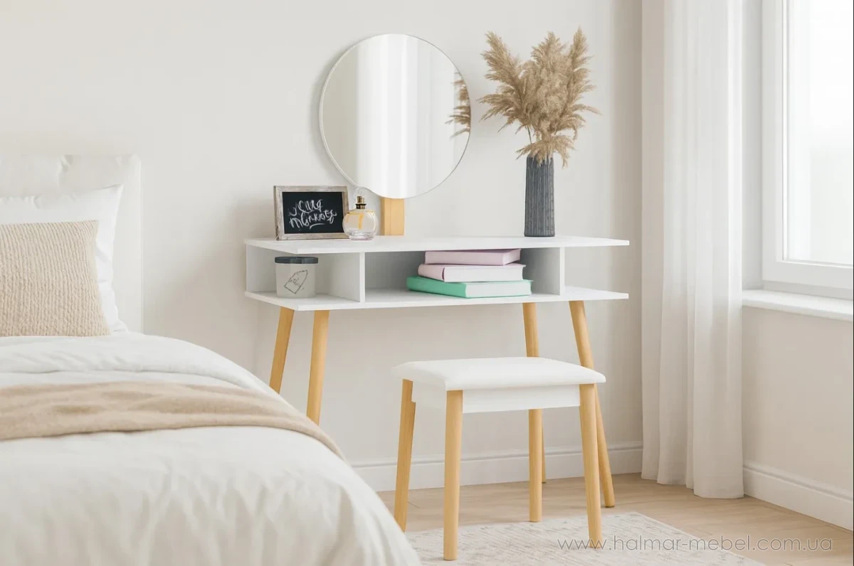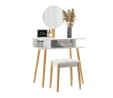 Стіл для макіяжу з дзеркалом та табуретом CHOMIK білий - привабливий комплект у скандинавському стилі для спальні або вбиральні. Він вдало поєднує цікавий дизайн, надійність і функціональність. Завдяки практичним полицям та зручному м'якому пуфу він забезпечить комфорт та порядок під час щоденного догляду та нанесення макіяжу.