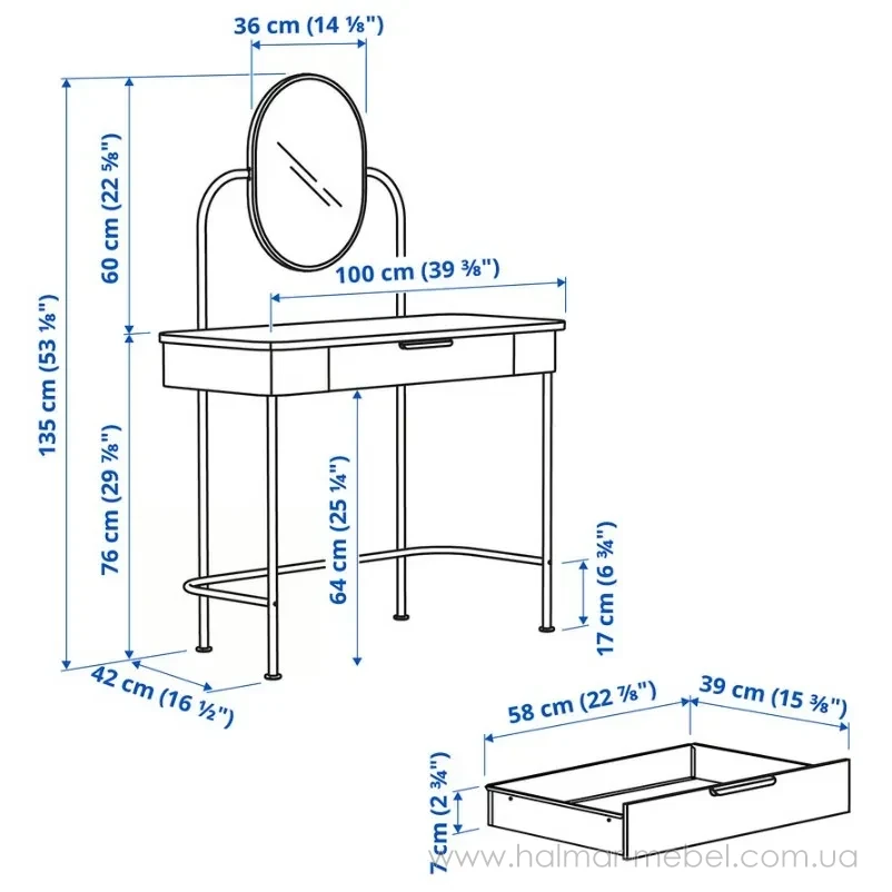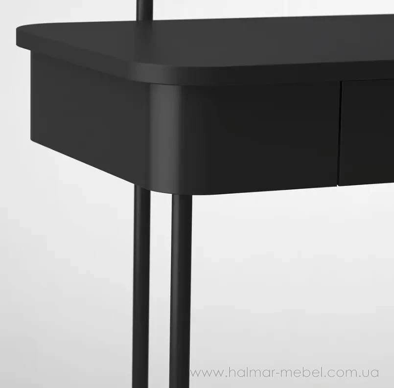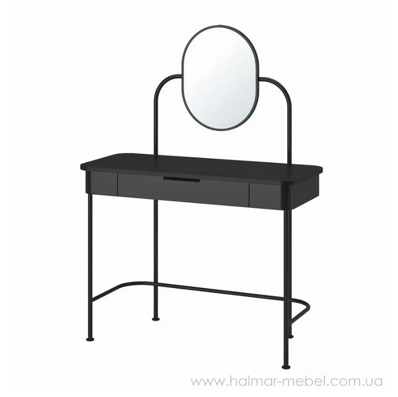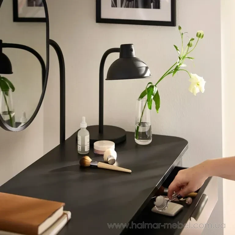 Туалетний столик GRÅFJÄLLET IKEA антрацит - елегантна модель у вінтажному стилі, яка стане гідним доповненням будь-якого інтер'єру. Конструкція столика складається зі сталевого каркаса, стільниці з висувним ящиком і дзеркала з регульованим кутом нахилу.
